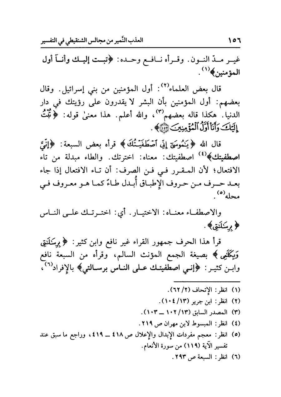 قال الله {يَا مُوسَى إِنِّي اصْطَفَيْتُكَ} قرأه بعض السبعة: {إنّيَّ اصْطَفَيْتُكَ} (¬٤) اصطفيتك: معناه: اخترتك. والطاء مبدلة من تاء الافتعال؛ لأن المقرر في فن الصرف: أن تاء الافتعال إذا جاءت بعد حرف من حروف الإطباق أُبدلت طاءً كما هو معروف في محله (¬٥).