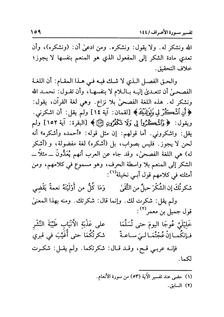 والحق الفصل الذي لا شك فيه في هذا المقام: أن اللغة الفصحى أن تتعدى إليه باللام لا بنفسها، وأن تقول: نحمد الله ونشكر له. هذه اللغة الفصحى بلا نزاع. وهي لغة القرآن، يقول: {أَنِ اشْكُرْ لِي وَلِوَالِدَيْكَ} [لقمان: آية ١٤] ولم يقل: أن اشكرني. ويقول: {وَاشْكُرُواْ لِي وَلَا تَكْفُرُونِ} [البقرة: آية ١٥٢] ولم يقل: واشكروني. أما قولهم: إن مثل قوله: (أحمده وأشكره) أنه لحن لا يجوز. فليس بصواب، بل (أشكره) لغة مفضولة، و (أشكر له) هي اللغة الفصحى، وقد جاء عن العرب أنهم يُعَدُّونَ -مثلاً- الشكر إلى المنعم بلا واسطة الحرف، وهو متبوع في كلامهم، ومن أمثلته في كلامهم قول أبي نخيلة (¬١):