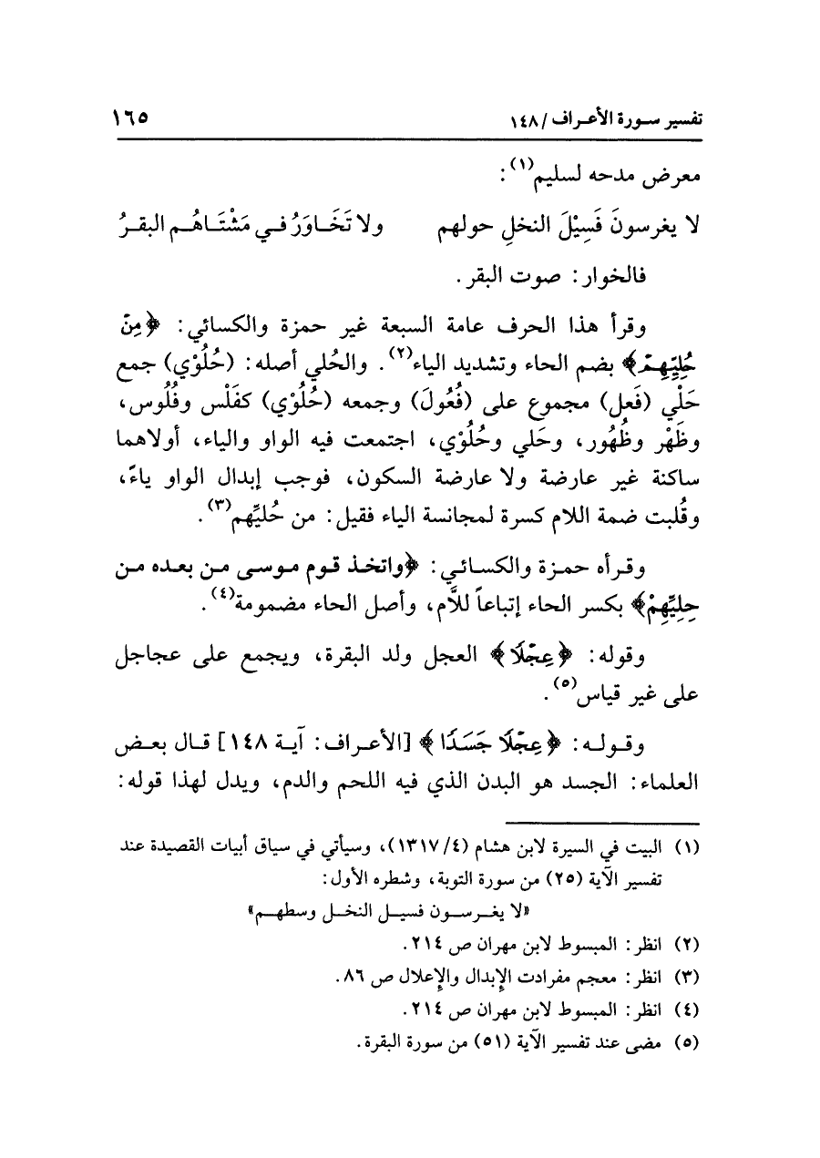 وقرأ هذا الحرف عامة السبعة غير حمزة والكسائي: {مِنْ حُلِيِّهِمْ} بضم الحاء وتشديد الياء (¬٢). والحُلي أصله: (حُلُوْي) جمع حَلْي (فَعل) مجموع على (فُعُولَ) وجمعه (حُلُوْي) كفَلْس وفُلُوس، وظَهْر وظُهُور، وحَلي وحُلُوْي، اجتمعت فيه الواو والياء، أولاهما ساكنة غير عارضة ولا عارضة السكون، فوجب إبدال الواو ياءً، وقُلبت ضمة اللام كسرة لمجانسة الياء فقيل: من حُليِّهم (¬٣).
