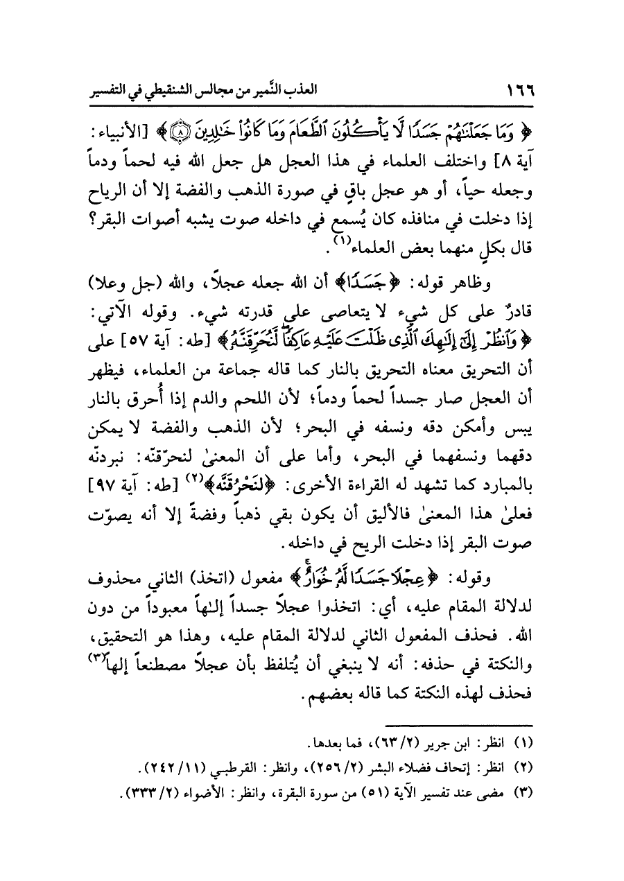 {وَمَا جَعَلْنَاهُمْ جَسَدًا لَاّ يَأْكُلُونَ الطَّعَامَ وَمَا كَانُوا خَالِدِينَ (٨)} [الأنبياء: آية ٨] واختلف العلماء في هذا العِجْلِ هل جعل الله فيه لحْمًا ودَمًا وجعله حيًّا، أو هو عجل باقٍ في صورة الذهب والفضة إلا أن الرياح إذا دخلت في منافذه كان يُسمع في داخله صوت يشبه أصوات البقر؟ قال بكلٍّ منهما بعض العلماء (¬١).