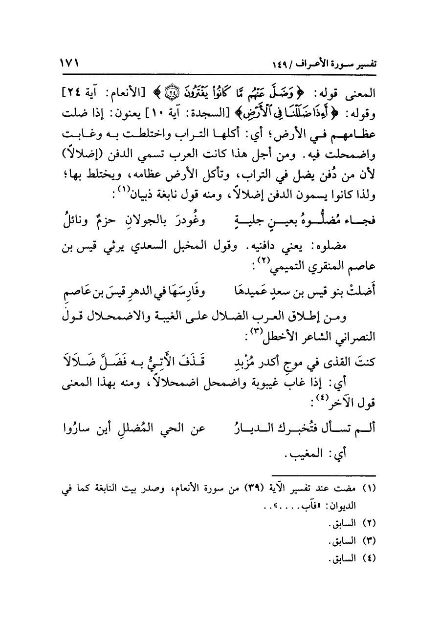 المعنى قوله: {وَضَلَّ عَنْهُم مَّا كَانُواْ يَفْتَرُونَ} [الأنعام: آية ٢٤] وقوله: {أَئِذَا ضَلَلْنَا فِي الأَرْضِ} [السجدة: آية ١٠] يعنون: إذا ضلت عظامهم في الأرض؛ أي: أكلها التراب واختلطت به وغابت واضمحلت فيه. ومن أجل هذا كانت العَرَبُ تسمِّي الدَّفْنَ (إضْلالاً) لأنَّ مَنْ دُفِنَ يَضِلّ في التّراب، وتأكل الأرض عِظَامَهُ ويختلط بها؛ ولذا كانوا يسمون الدفن إضلالاً، ومنه قول نابغة ذبيان (¬١):