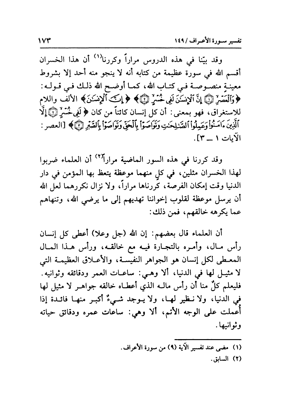 وقد بيّنا في هذه الدروس مرارًا وكررنا (¬١) أن هذا الخسران أقسم الله في سورة عظيمة من كتابه أنه لا ينجو منه أحد إلا بشروط معينةٍ منصوصة في كتاب الله، كما أوضح الله ذلك في قوله: {وَالْعَصْرِ (١) إِنَّ الإِنسَانَ لَفِي خُسْرٍ (٢)} {إِنَّ الإِنسَانَ} الألف واللام للاستغراق، فهو بمعنى: أن كل إنسان كائنًا من كان {لَفِي خُسْرٍ (٢) إِلَاّ الَّذِينَ آمَنُوا وَعَمِلُوا الصَّالِحَاتِ وَتَوَاصَوْا بِالْحَقِّ وَتَوَاصَوْا بِالصَّبْرِ (٣)} [العصر: الآيات ١ - ٣].