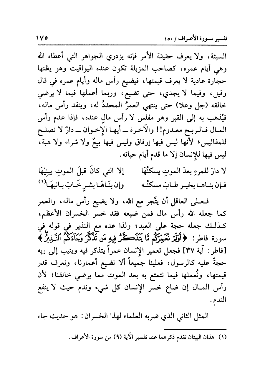 فعلى العاقل أن يَتَّجِرَ مَع الله، ولا يضيِّع رَأْسَ مَالِهِ، والعمر كما جعله الله رَأْسَ مَالٍ فمَنْ ضَيَّعَهُ فَقَدْ خَسِرَ الخُسْرَانَ الأَعْظَم، كذلك جعله حجة على العبد؛ ولذا عَدَّهُ مَعَ النذير في قوله في سورة فاطر: {أَوَلَمْ نُعَمِّرْكُم مَّا يَتَذَكَّرُ فِيهِ مَن تَذَكَّرَ وَجَاءكُمُ النَّذِيرُ} [فاطر: آية ٣٧] فجعل تعمير الإنسان عمرًا يتذَكَّر فيه ويُنِيبُ إلى رَبِّهِ حُجَّةً عليه كالرسول، فعلينا جميعًا ألا نضيع أعمارنا، ونعرف قدر قيمتها، ونُعْمِلُهَا فيمَا نَتَمَتَّعُ بِهِ بَعْدَ المَوْتِ مِمَّا يُرْضِي خالقنا؛ لأن رأس المال إِنْ ضَاع خَسِرَ الإنسان كل شيء وَنَدِمَ حيث لا ينفع النَّدم.