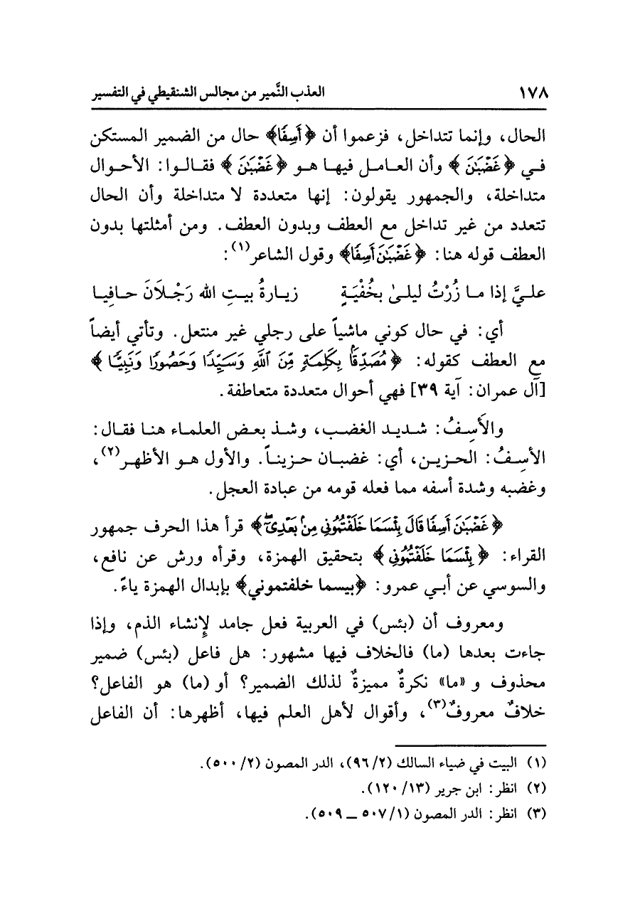الحال، وإنما تتداخل، فزعموا أن {أَسِفًا} حال من الضمير المستكن في {غَضْبَانَ} وأن العامل فيها هو {غَضْبَانَ} فقالوا: الأحوال متداخلة، والجمهور يقولون: إنها متعددة لا متداخلة، وأن الحال تتعدد من غير تداخل مع العطف وبدون العطف. ومن أمثلتها بدون العطف قوله هنا: {غَضْبَانَ أَسِفًا} وقول الشاعر (¬١):