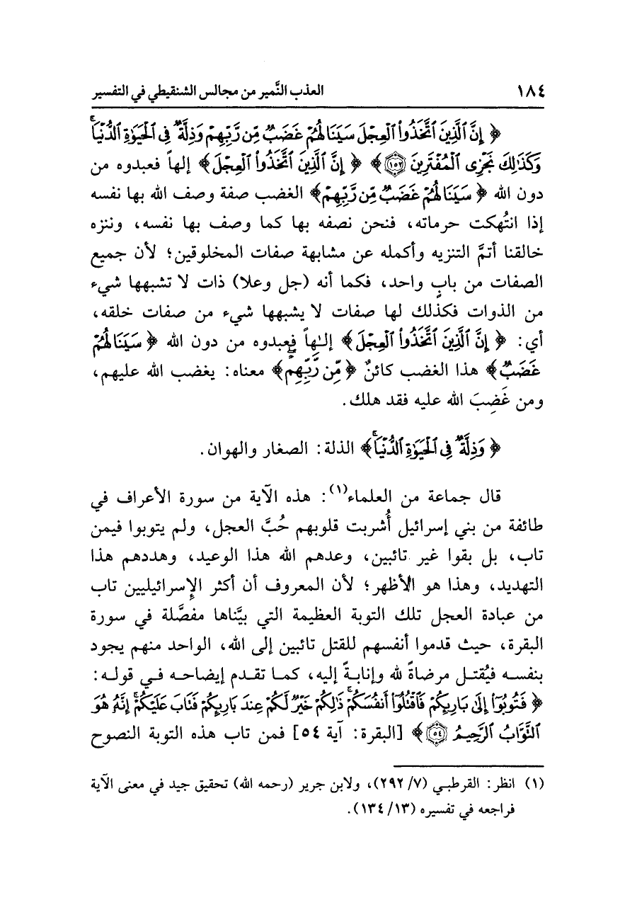 {إِنَّ الَّذِينَ اتَّخَذُواْ الْعِجْلَ سَيَنَالُهُمْ غَضَبٌ مِّن رَّبِّهِمْ وَذِلَّةٌ فِي الْحَياةِ الدُّنْيَا وَكَذَلِكَ نَجْزِي الْمُفْتَرِينَ (١٥٢)} {إِنَّ الَّذِينَ اتَّخَذُواْ الْعِجْلَ} إلهًا فعبدوه من دون الله {سَيَنَالُهُمْ غَضَبٌ مِّن رَّبِّهِمْ} الغضب صفة وصف الله بها نفسه إذا انتُهكت حرماته، فنحن نصفه بها كما وصف بها نفسه، وننزه خالقنا أتمَّ التنزيه وأكمله عن مشابهة صفات المخلوقين؛ لأن جميع الصفات من بابِ واحد، فكما أنه (جل وعلا) ذات لا تشبهها شيء من الذوات فكذلك لها صفات لا يشبهها شيء من صفات خلقه، أي: {إِنَّ الَّذِينَ اتَّخَذُواْ الْعِجْلَ} إلهًا فعبدوه من دون الله {سَيَنَالُهُمْ غَضَبٌ} هذا الغضب كائنٌ {مِّن رَّبِّهِمْ} معناه: يغضب الله عليهم، ومن غَضِبَ الله عليه فقد هلك.