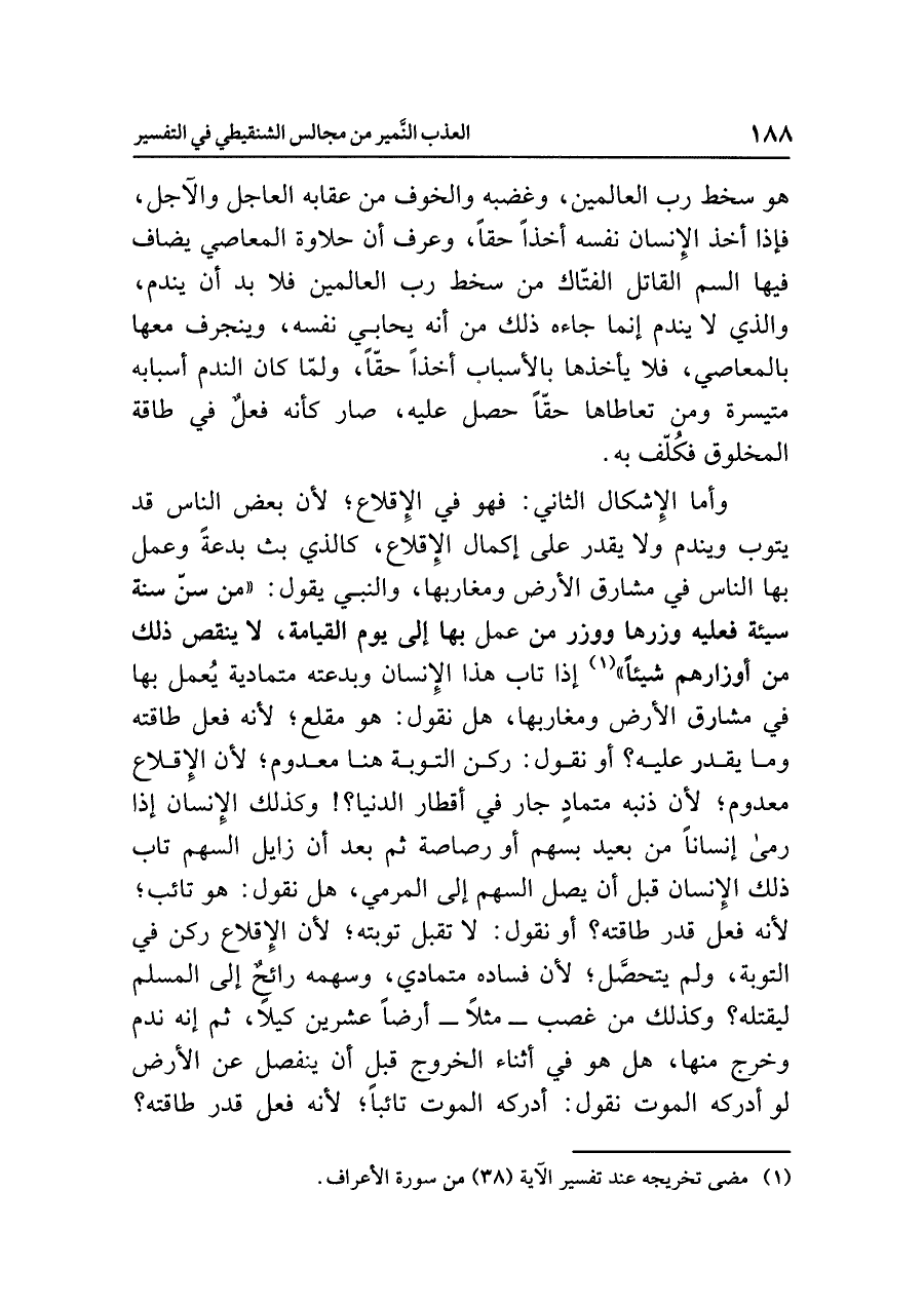 وأما الإشكال الثاني: فهو في الإقلاع؛ لأن بعض الناس قد يتوب ويندم ولا يقدر على إكمال الإقلاع، كالذي بث بدعةً وعمل بها الناس في مشارق الأرض ومغاربها، والنبي يقول: «مَنْ سَنَّ سُنَّةً سَيِّئَةً فَعَلَيْهِ وِزْرُهَا وَوِزْرُ مَنْ عَمِلَ بِهَا إِلَى يَوْمِ الْقِيَامَةِ، لَا يَنْقُصُ ذَلِكَ مِنْ أَوْزَارِهِمْ شَيْئًا» (¬١) إذا تاب هذا الإنسان وبدعته متمادية يُعمل بها في مشارق الأرض ومغاربها، هل نقول: هو مقلع؛ لأنه فعل طاقته وما يقدر عليه؟ أو نقول: ركن التوبة هنا معدوم؛ لأن الإقلاع معدوم؛ لأن ذنبه متمادٍ جار في أقطار الدنيا؟! وكذلك الإنسان إذا رمى إنسانًا من بعيد بسهم أو رصاصة ثم بعد أن زايل السهم تاب ذلك الإنسان قبل أن يصل السهم إلى المرمى، هل نقول: هو تائب؛ لأنه فعل قدر طاقته؟ أو نقول: لا تقبل توبته؛ لأن الإقلاع ركن في التوبة، ولم يتحصَّل؛ لأن فساده متمادي، وسهمه رائحٌ إلى المسلم ليقتله؟ وكذلك من غصب - مثلاً - أرضًا عشرين كيلاً، ثم إنه ندم وخرج منها، هل هو في أثناء الخروج قبل أن ينفصل عن الأرض لو أدركه الموت نقول: أدركه الموت تائبًا؛ لأنه فعل قدر طاقته؟