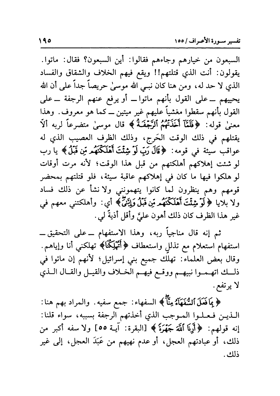 السبعون من خيارهم وجاءهم فقالوا: أين السبعون؟ فقال: ماتوا. يقولون: أنت الذي قتلتهم!! ويقع فيهم الخلاف والشقاق والفساد الذي لا حد له، ومن هنا كان نبي الله موسى حريصًا جدًّا على أن الله يحييهم -على القول بأنهم ماتوا- أو يرفع عنهم الرجفة -على القول بأنهم سقطوا مغشيًا عليهم غير ميتين- كما هو معروف. وهذا معنى قوله: {فَلَمَّا أَخَذَتْهُمُ الرَّجْفَةُ} قال موسى متضرِّعًا لِرَبِّهِ ألاّ يقتلهم في ذلك الوقت الحَرِج، وذلك الظرف العصيب الذي له عواقب سيئة في قومه: {قَالَ رَبِّ لَوْ شِئْتَ أَهْلَكْتَهُم مِّن قَبْلُ} يا رب لو شئت إهلاكهم أهلكتهم من قبل هذا الوقت؛ لأنه مَرَّتْ أوْقَات لو هلكوا فيها ما كان في إهلاكهم عاقبة سيئة، فلو قتلتهم بمحضر قَوْمِهِمْ وهم ينظرون لما كانوا يَتَّهِمُونِي ولا نشأ عن ذلك فساد ولا بلايا {لَوْ شِئْتَ أَهْلَكْتَهُم مِّن قَبْلُ وَإِيَّايَ} أي: وأهْلَكْتَنِي مَعَهُمْ في غير هذا الظرف كان ذلك أهون عليَّ وأقل أذيةً لي.