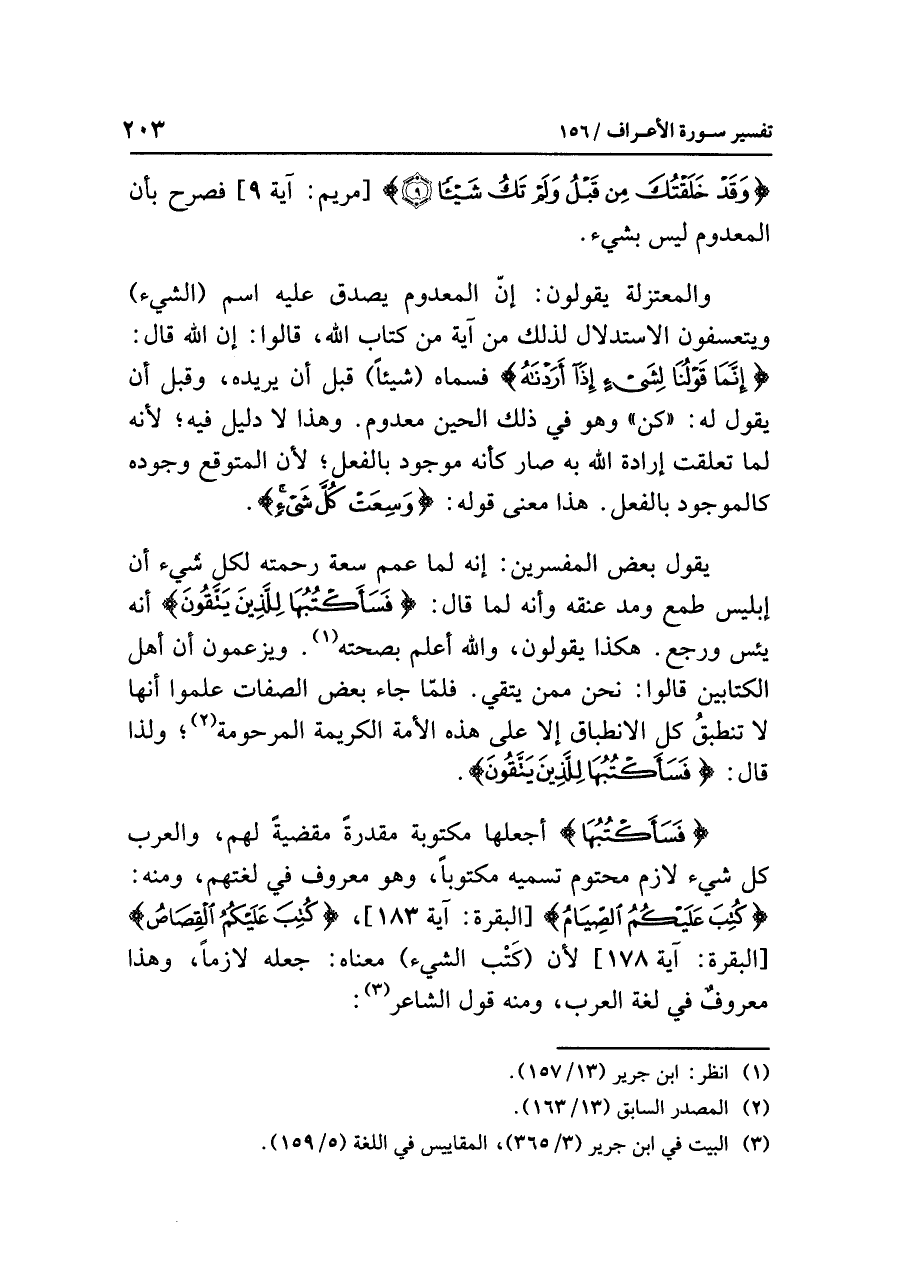 {فَسَأَكْتُبُهَا} أجعلها مكتوبة مُقَدَّرَةً مقضيةً لهم، والعرب كل شيء لازم محتوم تسميه مكتوبًا، وهو معروف في لغتهم، ومنه: {كُتِبَ عَلَيْكُمُ الصِّيَامُ} [البقرة: آية ١٨٣] {كُتِبَ عَلَيْكُمُ الْقِصَاصُ} [البقرة: آية ١٧٨] لأن (كَتْب الشيء) معناه: جعله لازمًا، وهذا معروفٌ في لغة العرب، ومنه قول الشاعر (¬٣):
