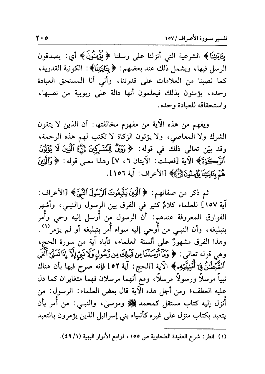 ثم ذكر من صفاتهم: {الَّذِينَ يَتَّبِعُونَ الرَّسُولَ النَّبِيَّ} [الأعراف: آية ١٥٧] للعلماء كلامٌ كثير في الفرق بين الرسول والنبي، وأشهر الفوارق المعروفة عندهم: أن الرسول من أُرسل إليه وحي وأُمر بتبليغه، وأن النبي من أُوحي إليه سواء أُمر بتبليغه أو لم يؤمر (¬١). وهذا الفرق مشهورٌ على ألسنة العلماء، تأباه آية من سورة الحج، وهي قوله تعالى: {وَمَا أَرْسَلْنَا مِن قَبْلِكَ مِن رَّسُولٍ وَلَا نَبِيٍّ إِلَاّ إِذَا تَمَنَّى أَلْقَى الشَّيْطَانُ فِي أُمْنِيَّتِهِ} الآية [الحج: آية ٥٢] فإنه صرح فيها بأن هناك نبيًا مرسلاً ورسولاً مرسلاً، ومع أنهما مرسلان فهما متغايران كما دل عليه العطف؛ ومن أجل هذه الآية قال بعض العلماء: الرسول: من أُنزل إليه كتاب مستقل كمحمد صلى الله عليه وسلم وموسى، والنبي: من أُمر بأن يتعبد بكتاب منزل على غيره كأنبياء بني إسرائيل الذين يؤمرون بالتعبد