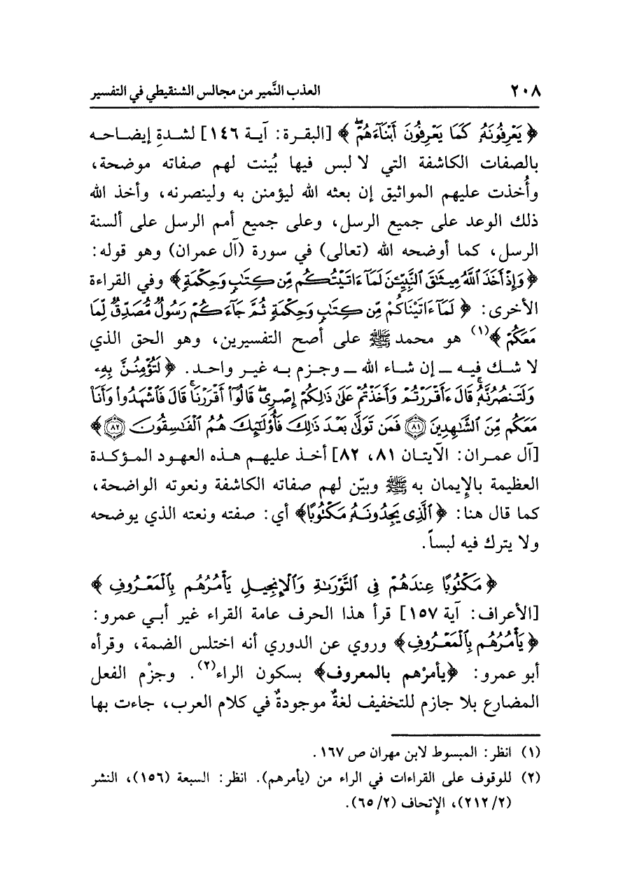 {يَعْرِفُونَهُ كَمَا يَعْرِفُونَ أَبْنَاءَهُمْ} [البقرة: آية ١٤٦] لشدةِ إيضاحه بالصفات الكاشفة التي لا لبس فيها بُينت لهم صفاته موضحة، وأُخذت عليهم المواثيق إن بعثه الله ليؤمنن به ولينصرنه، وأخذ الله ذلك الوعد على جميع الرسل، وعلى جميع أمم الرسل على ألسنة الرسل، كما أوضحه الله (تعالى) في سورة (آل عمران) وهو قوله: {وَإِذْ أَخَذَ اللَّهُ مِيثَاقَ النَّبِيِّيْنَ لَمَا آتيناكم مِّن كِتَابٍ وَحِكْمَةٍ} وفي القراءة الأخرى: {لماءَاتَيْتُكُم مِّن كِتَابٍ وَحِكْمَةٍ ثُمَّ جَاءَكُمْ رَسُولٌ مُّصَدِّقٌ لِّمَا مَعَكُمْ} (¬١) هو محمد صلى الله عليه وسلم على أصح التفسيرين، وهو الحق الذي لا شك فيه -إن شاء الله- وجزم به غير واحد {لَتُؤْمِنُنَّ بِهِ وَلَتَنصُرُنَّهُ قَالَءَأَقْرَرْتُمْ وَأَخَذْتُمْ عَلَى ذَلِكُمْ إِصْرِي قَالُواْ أَقْرَرْنَا قَالَ فَاشْهَدُواْ وَأَنَاْ مَعَكُم مِّنَ الشَّاهِدِينَ (٨١) فَمَن تَوَلَّى بَعْدَ ذَلِكَ فَأُوْلَئِكَ هُمُ الْفَاسِقُونَ (٨٢)} [آل عمران: الآيتان ٨١، ٨٢] أخذ عليهم هذه العهود المؤكدة العظيمة بالإيمان به صلى الله عليه وسلم وبيّن لهم صفاته الكاشفة ونعوته الواضحة، كما قال هنا: {الَّذِي يَجِدُونَهُ مَكْتُوبًا} أي: صفته ونعته الذي يوضحه ولا يترك فيه لبسًا.