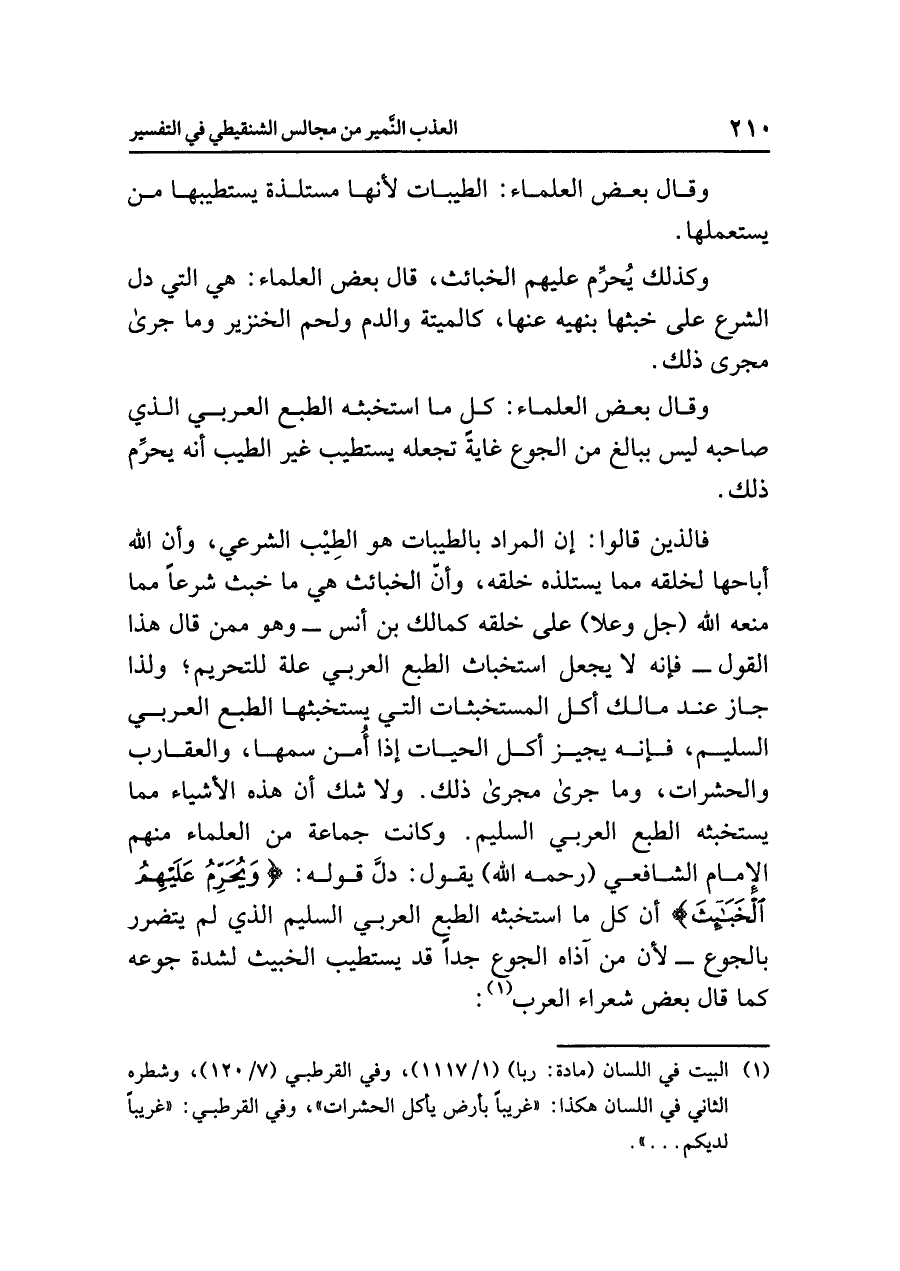 فالذين قالوا: إن المراد بالطيبات هو الطيب الشرعي، وأن الله أباحها لخلقه مما يستلذه خلقه، وأنّ الخبائث هي ما خبث شرعًا مما منعه الله (جل وعلا) على خلقه كمالك بن أنس - وهو ممن قال هذا القول- فإنه لا يجعل استخباث الطبع العربي علة للتحريم؛ ولذا جاز عند مالك أكل المستخبثات التي يستخبثها الطبع العربي السليم، فإنه يجيز أكل الحيات إذا أُمن سمها، والعقارب والحشرات، وما جرى مجرى ذلك. ولا شك أن هذه الأشياء مما يستخبثه الطبع العربي السليم. وكانت جماعة من العلماء منهم الإمام الشافعي (رحمه الله) يقول: دلَّ قوله: {وَيُحَرِّمُ عَلَيْهِمُ الْخَبَآئِثَ} أن كل ما استخبثه الطبع العربي السليم الذي لم يتضرر بالجوع- لأن مَنْ آذاه الجوع جِدًّا قد يستطيب الخبيث لشدة جوعه كما قال بعض شعراء العرب (¬١):