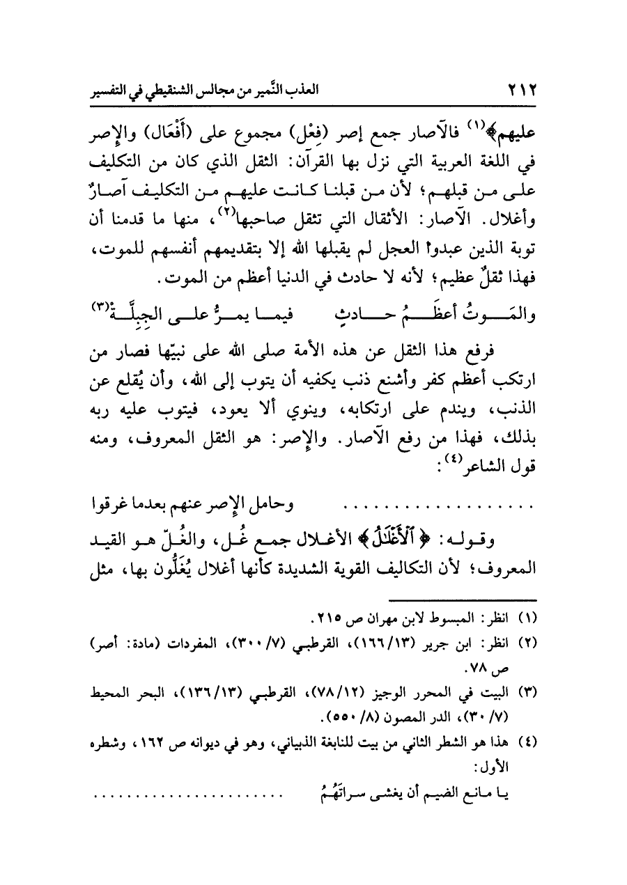 عليهم} (¬١) فالآصار جمع إصر (فِعْل) مجموع على (أَفْعَال) والإصر في اللغة العربية التي نزل بها القرآن: الثقل الذي كان من التكليف على من قبلهم؛ لأنَّ مَنْ قَبْلَنَا كانت عليهم من التكليف آصارٌ وأغلال. الآصار: الأثقال التي تثقل صاحبها (¬٢)، منها ما قدمنا أن توبة الذين عبدوا العجل لم يقبلها الله إلا بتقديمهم أنفسهم للموت، فهذا ثقلٌ عظيم؛ لأنه لا حادث في الدنيا أعظم من الموت.