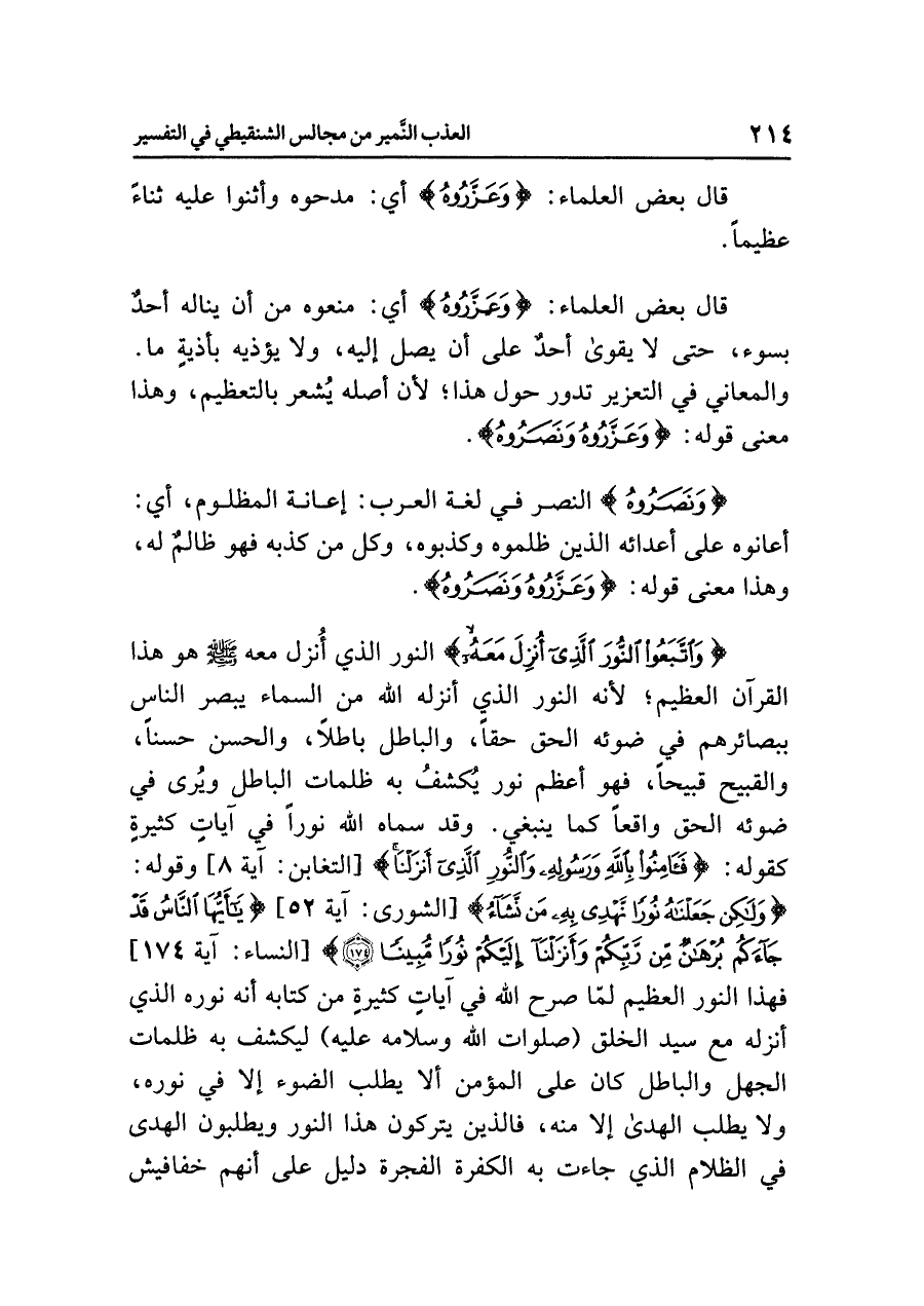 {وَنَصَرُوهُ} النصر في لغة العرب: إعانة المظلوم، أي: أعانوه على أعدائه الذين ظلموه وكذبوه، وكل من كذبه فهو ظالمٌ له، وهذا معنى قوله: {وَعَزَّرُوهُ وَنَصَرُوهُ}.