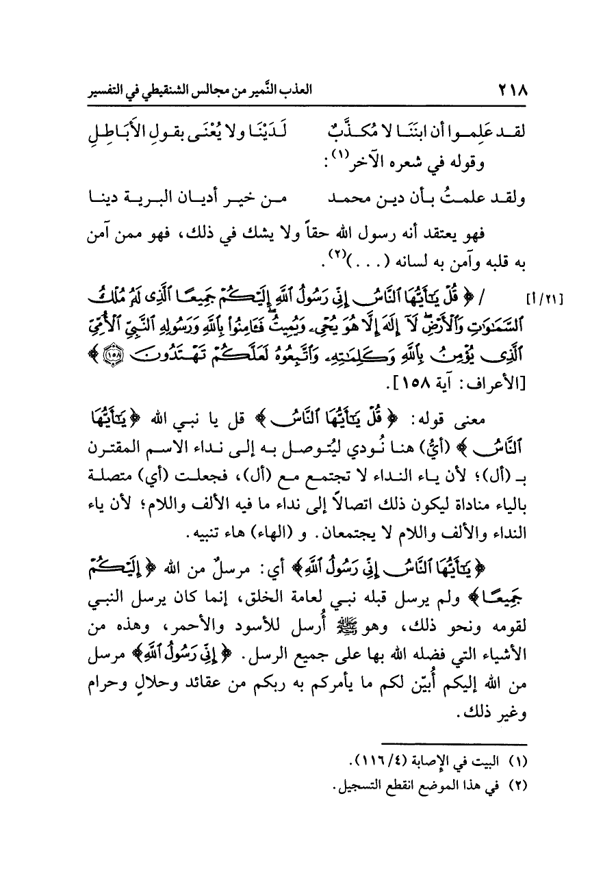 معنى قوله: {قُلْ يَا أَيُّهَا النَّاسُ} قل يا نبي الله {يَا أَيُّهَا النَّاسُ} (أيُّ) هنا نُودي ليُتوصل به إلى نداء الاسم المقترن بـ (أل)؛ لأن ياء النداء لا تجتمع مع (أل)، فجعلت (أي) متصلة بالياء مناداة ليكون ذلك اتصالاً إلى نداء ما فيه الألف واللام؛ لأن (يا) النداء والألف واللام لا يجتمعان. و (الهاء) هاء تنبيه.