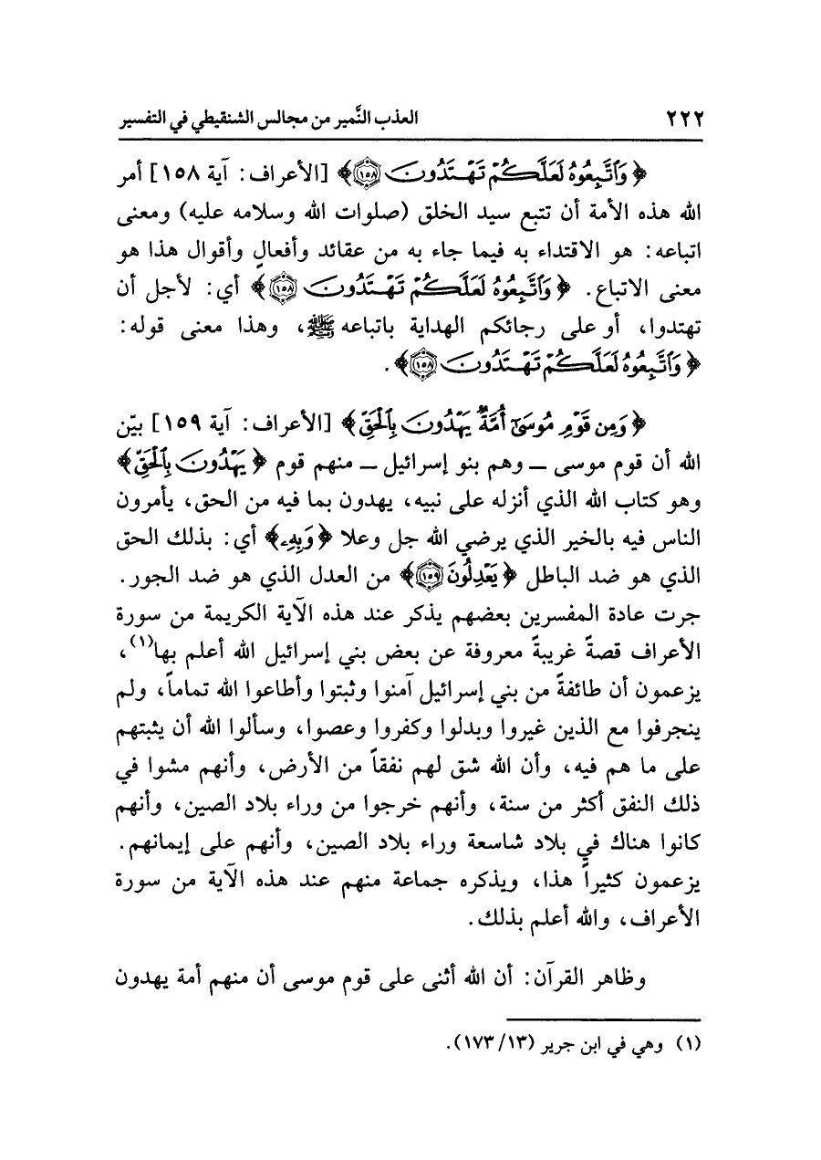 {وَمِن قَوْمِ مُوسَى أُمَّةٌ يَهْدُونَ بِالْحَقِّ} [الأعراف: آية ١٥٩] بيّن الله أن قوم موسى -وهم بنو إسرائيل- منهم قوم {يَهْدُونَ بِالْحَقِّ} وهو كتاب الله الذي أنزله على نبيه، يهدون بما فيه من الحق، يأمرون الناس فيه بالخير الذي يرضي الله جل وعلا {وَبِهِ} أي: بذلك الحق الذي هو ضد الباطل {يَعْدِلُونَ} من العدل الذي هو ضد الجور. جرت عادة المفسرين بعضهم يذكر عند هذه الآية الكريمة من سورة الأعراف قصةً غريبةً معروفة عن بعض بني إسرائيل الله أعلم بها (¬١)، يزعمون أن طائفة من بني إسرائيل آمنوا وثبتوا وأطاعوا الله تمامًا، ولم ينجرفوا مع الذين غَيَّرُوا وبَدَّلُوا وكفروا وعصوا، وسألوا الله أن يثبتهم على ما هم فيه، وأن الله شق لهم نفقًا من الأرض، وأنهم مشوا في ذلك النفق أكثر من سنة، وأنهم خرجوا من وراء بلاد الصين، وأنهم كانوا هناك في بلاد شاسعة وراء بلاد الصين، وأنهم على إيمانهم، يزعمون كثيرًا هذا، ويذكره جماعة منهم عند هذه الآية من سورة الأعراف، والله أعلم بذلك.