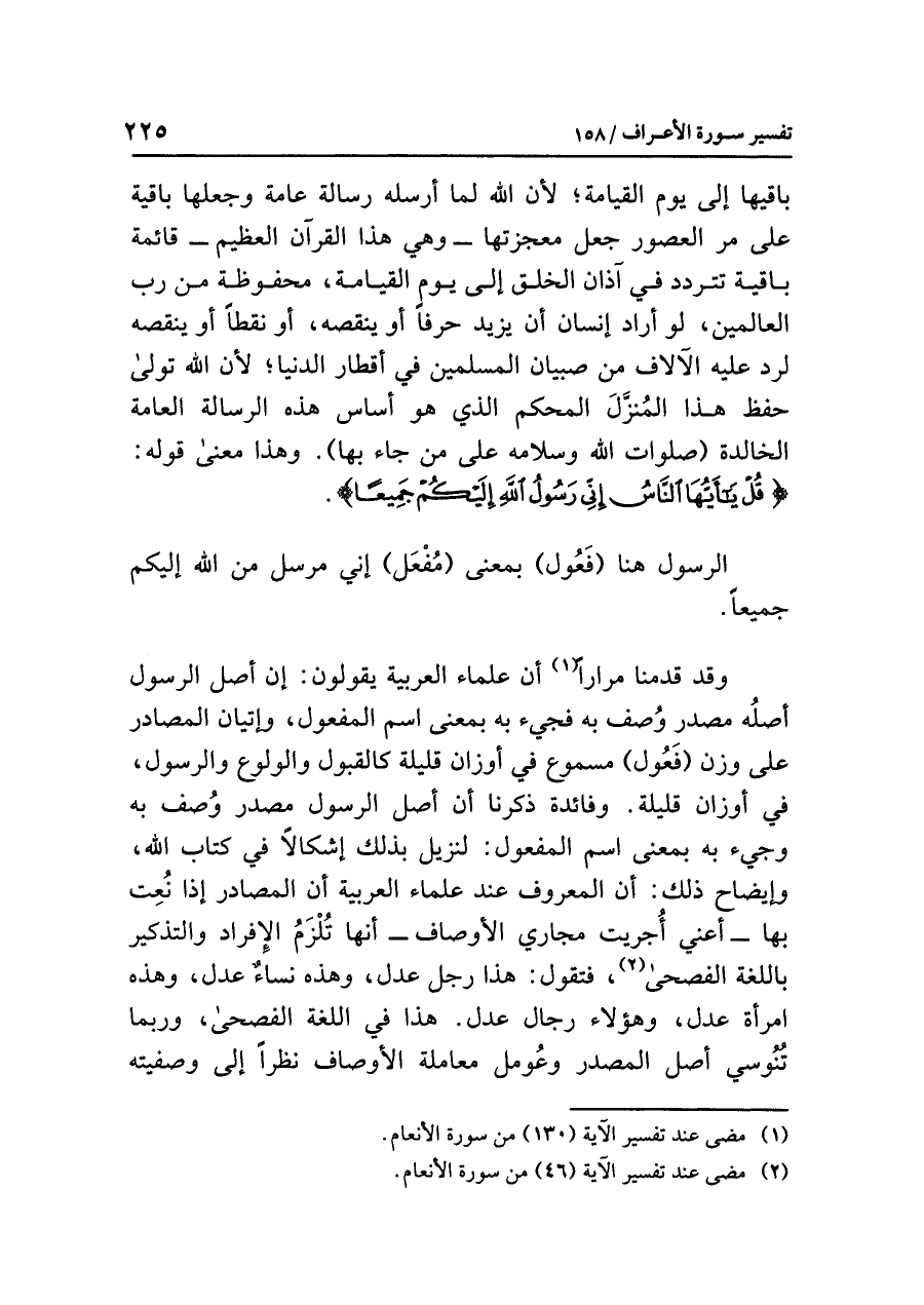 وقد قدمنا مرارًا (¬١) أن علماء العَرَبِيَّة يقولون: إن أصل الرسول أصلُه مصدر وُصف به فجيء به بمعنى اسم المفعول، وإتيان المصادر على وزن (فَعُول) مسموع في أوزان قليلة كالقبول والولوع والرسول، في أوزان قليلة. وفائدة ذكرنا أن أصل الرسول مصدر وُصف به وجيء به بمعنى اسم المفعول؛ لنُزِيل بذلك إشكالاً في كتاب الله، وإيضاح ذلك: أن المعروف عند عُلَمَاءِ العَرَبِيَّة أن المصادر إذا نُعِت بها -أعني أُجريت مجاري الأوصاف- أنها تُلْزَمُ الإفراد والتذكير باللغة الفصحى (¬٢)، فتقول: هذا رجل عدل، وهذه نساءٌ عدل، وهذه امرأة عدل، وهؤلاء رجال عدل. هذا في اللغة الفصحى، وربما تُنُوسي أصل المصدر وعُومل معاملة الأوصاف نظرًا إلى وصفيته