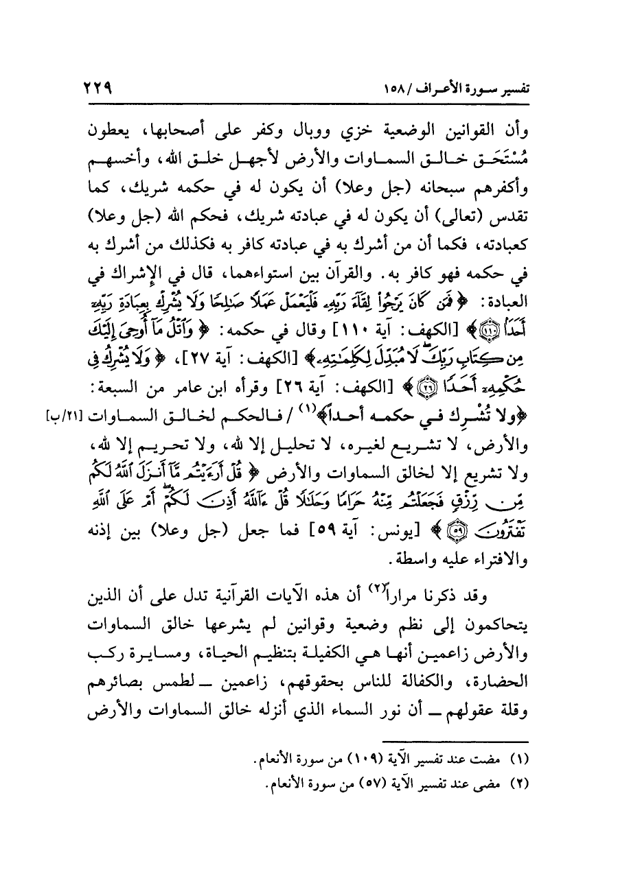 والقرآن بين استوائهما، قال في الإشراك في العبادة: {فَمَن كَانَ يَرْجُو لِقَاء رَبِّهِ فَلْيَعْمَلْ عَمَلاً صَالِحًا وَلَا يُشْرِكْ بِعِبَادَةِ رَبِّهِ أَحَدًا} [الكهف: آية ١١٠] وقال في حكمه: {وَاتْلُ مَا أُوحِيَ إِلَيْكَ مِن كِتَابِ رَبِّكَ لَا مُبَدِّلَ لِكَلِمَاتِهِ} [الكهف: آية ٢٧] {وَلَا يُشْرِكُ فِي حُكْمِهِ أَحَدًا} [الكهف: آية ٢٦] وقرأه ابن عامر من السبعة: {ولا تُشْرِك في حكمه [٢١/ب] أحدًا} (¬١) / فالحكم لخالق السماوات والأرض، لا تشريع لغيره، لا تحليل إلا لله، ولا تحريم إلا لله، ولا تشريع إلا لخالق السماوات والأرض {قُلْ أَرَأَيْتُم مَّا أَنزَلَ اللَّهُ لَكُم مِّن رِّزْقٍ فَجَعَلْتُم مِّنْهُ حَرَامًا وَحَلَالاً قُلْ آللهُ أَذِنَ لَكُمْ أَمْ عَلَى اللَّهِ تَفْتَرُونَ (٥٩)} [يونس: آية ٥٩] فما جعل (جل وعلا) بين إذنه والافتراء عليه واسطة.
