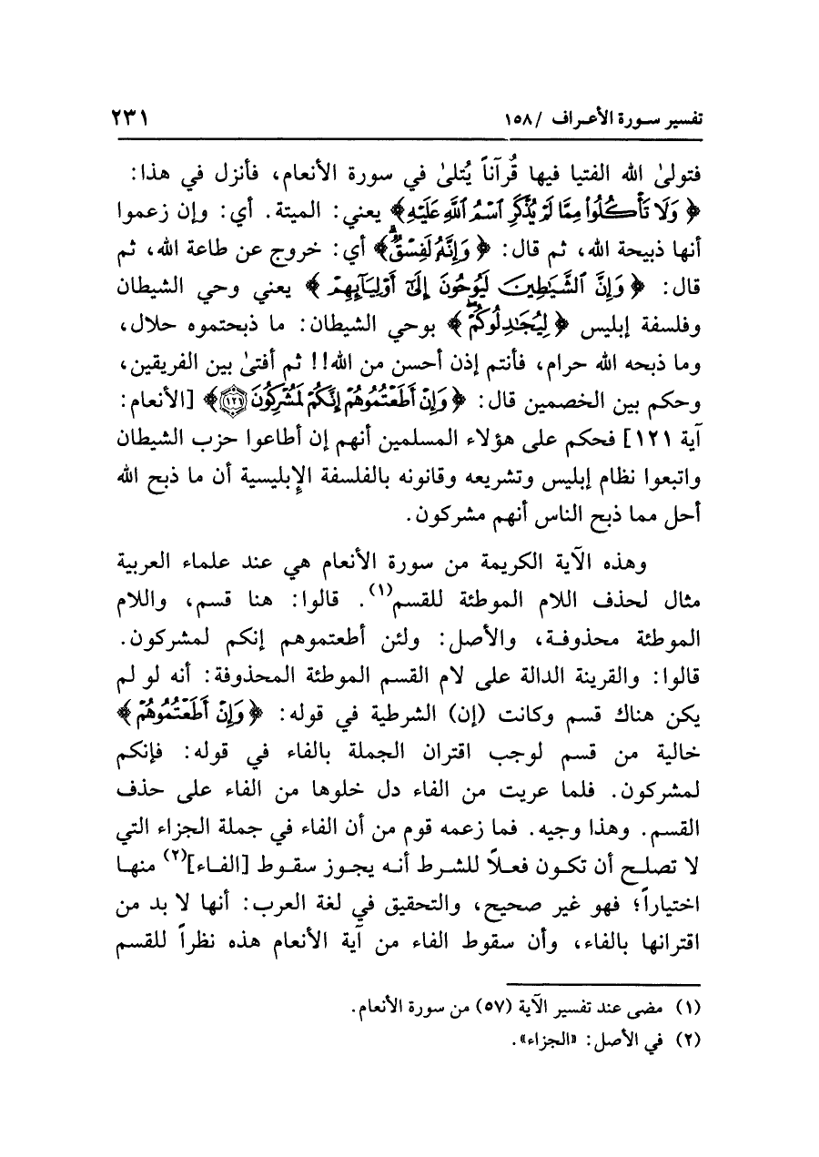 وهذه الآية الكريمة من سورة الأنعام هي عند علماء العربية مثال لحذف اللام الموطئة للقسم (¬١). قالوا: هنا قسم، واللام الموطئة محذوفة، والأصل: ولئن أطعتموهم إنكم لمشركون. قالوا: والقرينة الدالة على لام القسم الموطئة المحذوفة: أنه لو لم يكن هناك قسم وكانت (إن) الشرطية في قوله: {وَإِنْ أَطَعْتُمُوهُمْ} خالية من قسم لوجب اقتران الجملة بالفاء في قوله: فإنكم لمشركون. فلما عريت من الفاء دل خلوها من الفاء على حذف القسم. وهذا وجيه. فما زعمه قَوْمٌ مِنْ أَنَّ الفَاءَ في جملة الجزاء التي لا تصلح أن تكون فعلاً للشرط أنه يجوز سقوط [الفاء] (¬٢) منها اختيارًا، فهو غير صحيح، والتحقيق في لغة العرب: أنها لا بد من اقترانها بالفاء، وأن سقوط الفاء من آية الأنعام هذه نظرًا للقسم