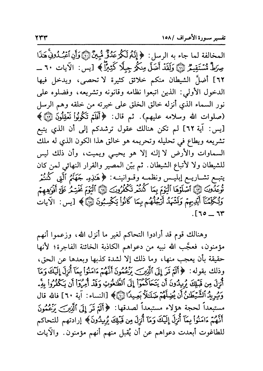 المخالفة لما جاء به الرسل: {إِنَّهُ لَكُمْ عَدُوٌّ مُّبِينٌ (٦٠) وَأَنِ اعْبُدُونِي هَذَا صِرَاطٌ مُّسْتَقِيمٌ (٦١) وَلَقَدْ أَضَلَّ مِنكُمْ جِبِلاً كَثِيرًا} [يس: الآيات ٦٠ - ٦٢] أضل الشيطان منكم خلائق كثيرة لا تحصى، ويدخل فيها الدخول الأوَّلِي: الذين اتبعوا نظامه وقانونه وتشريعه، وفضلوه على نور السماء الذي أنزله خالق الخلق على خيرته مِنْ خَلْقِهِ وهُمْ الرسل (صلوات الله وسلامه عليهم). ثم قال: {أَفَلَمْ تَكُونُوا تَعْقِلُونَ} [يس: آية ٦٢] لم تكن هنالك عقول ترشدكم إلى أن الذي يتبع تشريعه ويطاع في تحليله وتحريمه هو خالق هذا الكون الذي له ملك السماوات والأرض لا إله إلا هو يحيي ويميت، وأن ذلك ليس للشيطان ولا لاتباع الشيطان. ثم بيّن المصير والقرار النهائي لمن كان يتبع تشاريع إبليس ونظمه وقوانينه: {هَذِهِ جَهَنَّمُ الَّتِي كُنتُمْ تُوعَدُونَ (٦٣) اصْلَوْهَا الْيَوْمَ بِمَا كُنتُمْ تَكْفُرُونَ (٦٤) الْيَوْمَ نَخْتِمُ عَلَى أَفْوَاهِهِمْ وَتُكَلِّمُنَا أَيْدِيهِمْ وَتَشْهَدُ أَرْجُلُهُمْ بِمَا كَانُوا يَكْسِبُونَ (٦٥)} [يس: الآيات ٦٣ - ٦٥].