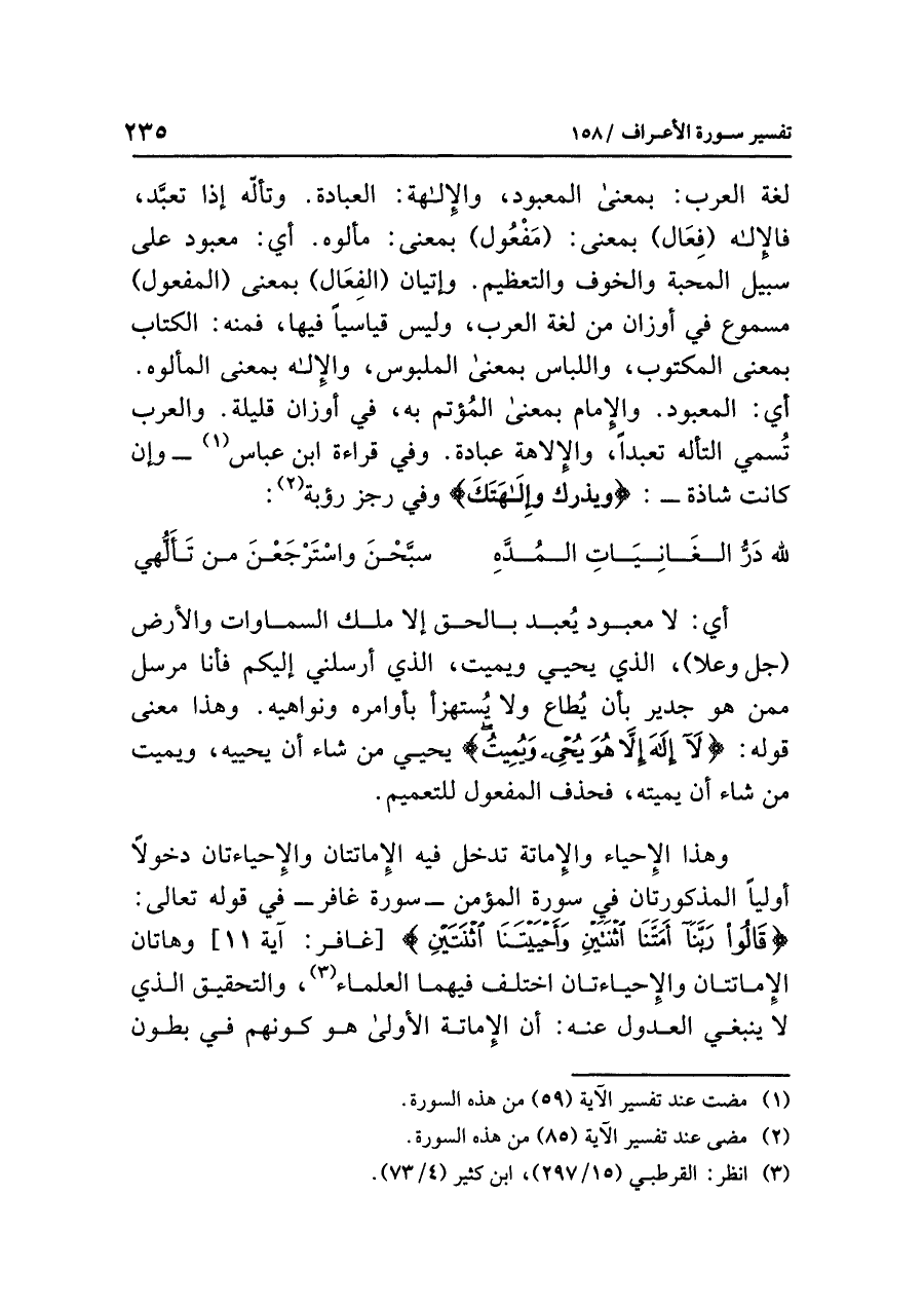 وهذا الإحياء والإماتة تدخل فيه الإماتتان والإحياءتان دخولاً أوليًّا المذكورتان في سورة المؤمن -سورة غافر- في قوله تعالى: {قَالُوا رَبَّنَا أَمَتَّنَا اثْنَتَيْنِ وَأَحْيَيْتَنَا اثْنَتَيْنِ} [غافر: آية ١١] وهاتان الإماتتان والإحياءتان اختلف فيهما العلماء (¬٣)، والتحقيق الذي لا ينبغي العدول عنه: أن الإماتة الأولى هو كونهم في بطون