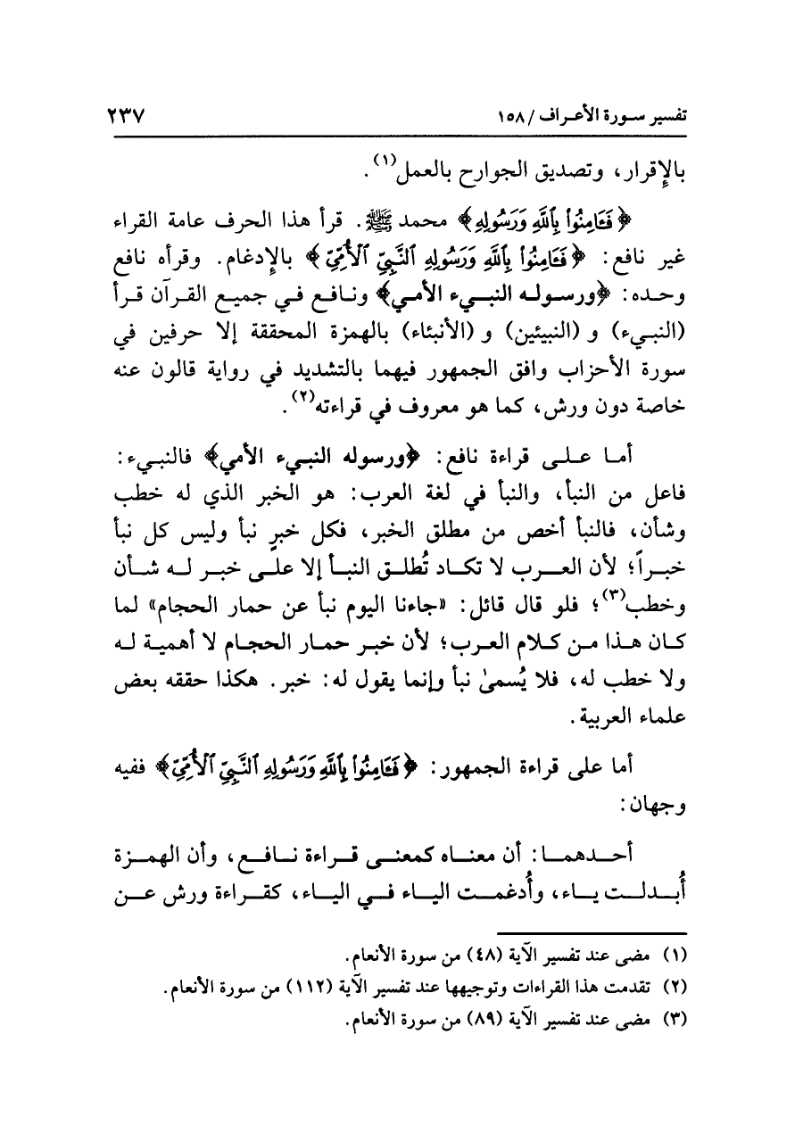 {فَآمِنُواْ بِاللَّهِ وَرَسُولِهِ} محمد صلى الله عليه وسلم. قرأ هذا الحرف عامة القراء غير نافع: {فَآمِنُواْ بِاللَّهِ وَرَسُولِهِ النَّبِيِّ الأُمِّيِّ} بالإدغام. وقرأه نافع وحده: {ورسوله النبيء الأمي} ونافع في جميع القرآن قرأ (النبيء) و (النبيئين) و (الأنبئاء) بالهمزة المحققة إلا حرفين في سورة الأحزاب وافق الجمهور فيهما بالتشديد في رواية قالون عنه خاصة دون ورش، كما هو معروف في قراءته (¬٢).