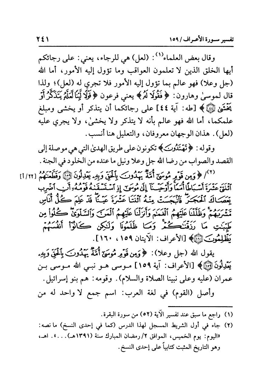 (¬٢) جاء في أول الشريط المسجل لهذا الدرس (كما في إحدى النسخ) ما نصه: «اليوم: يوم الخميس، الموافق ٢/ رمضان المبارك سنة (١٣٩١هـ) ... » اهـ، وهو التاريخ المثبت كتابيًّا على إحدى النسخ.