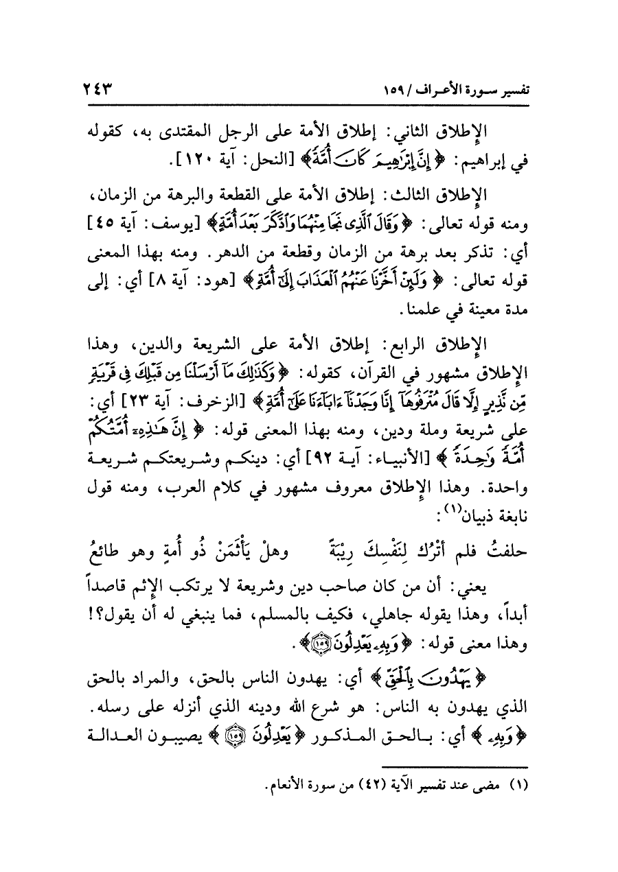الإطلاق الرابع: إطلاق الأمة على الشريعة والدين، وهذا الإطلاق مشهور في القرآن، كقوله: {وَكَذَلِكَ مَا أَرْسَلْنَا مِن قَبْلِكَ فِي قَرْيَةٍ مِّن نَّذِيرٍ إِلَاّ قَالَ مُتْرَفُوهَا إِنَّا وَجَدْنَا آبَاءنَا عَلَى أُمَّةٍ} [الزخرف: آية ٢٣] أي: على شريعة وملة ودين، ومنه بهذا المعنى قوله: {إِنَّ هَذِهِ أُمَّتُكُمْ أُمَّةً وَاحِدَةً} [الأنبياء: آية ٩٢] أي: دينكم وشريعتكم شريعة واحدة. وهذا الإطلاق معروف مشهور في كلام العرب، ومنه قول نابغة ذبيان (¬١):