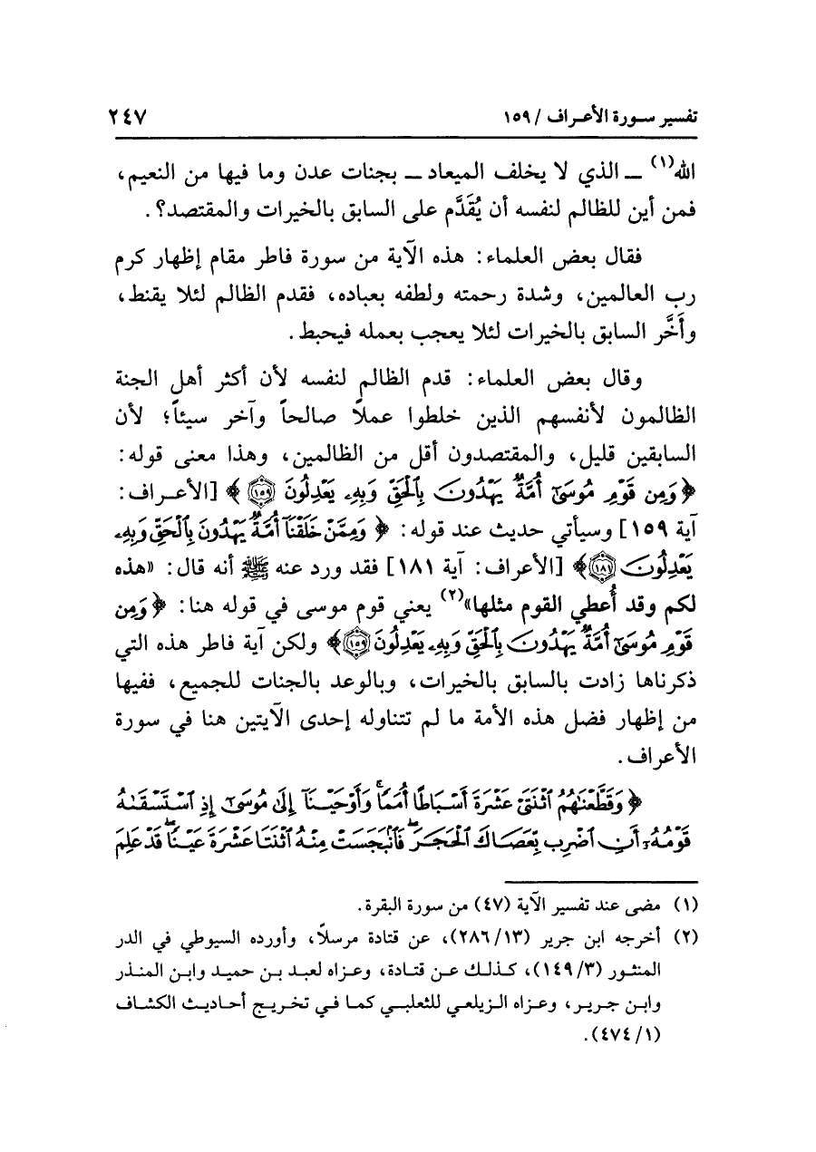 وقال بعض العلماء: قدم الظالم لنفسه لأن أكثر أهل الجنة الظالمون لأنفسهم الذين خلطوا عملاً صالحًا وآخر سيئًا؛ لأن السابقين قليل، والمقتصدون أقل من الظالمين، وهذا معنى قوله: {وَمِن قَوْمِ مُوسَى أُمَّةٌ يَهْدُونَ بِالْحَقِّ وَبِهِ يَعْدِلُونَ (١٥٩)} [الأعراف: آية ١٥٩] وسيأتي حديث عند قوله: {وَمِمَّنْ خَلَقْنَا أُمَّةٌ يَهْدُونَ بِالْحَقِّ وَبِهِ يَعْدِلُونَ (١٨١)} [الأعراف: آية ١٨١] فقد ورد عنه صلى الله عليه وسلم أنه قال: «هَذِهِ لَكُمْ وَقَدْ أُعْطِيَ القَوْمُ مِثْلَهَا» (¬٢) يعني قوم موسى في قوله هنا: {وَمِن قَوْمِ مُوسَى أُمَّةٌ يَهْدُونَ بِالْحَقِّ وَبِهِ يَعْدِلُونَ} ولكن آية فاطر هذه التي ذكرناها زادت بالسابق بالخيرات، وبالوعد بالجنات للجميع، ففيها من إظهار فضل هذه الأمة ما لم تتناوله إحدى الآيتين هنا في سورة الأعراف.