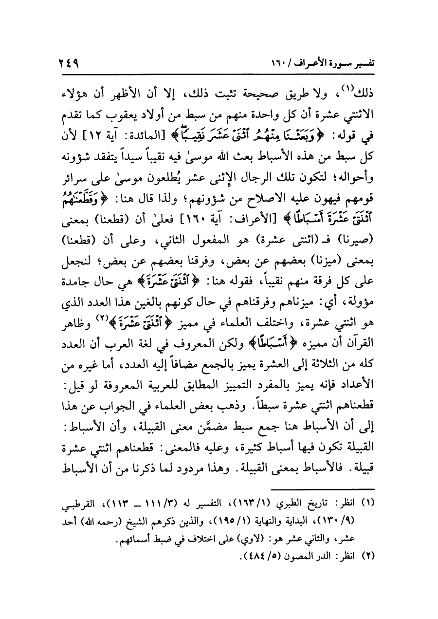 ذلك (¬١)، ولا طريق صحيحة تثبت ذلك، إلا أن الأظهر أن هؤلاء الاثنتي عشرة أن كل واحدة منهم من سبط من أولاد يعقوب كما تقدم في قوله: {وَبَعَثْنَا مِنهُمُ اثْنَيْ عَشَرَ نَقِيبًا} [المائدة: آية ١٢] لأن كل سبط من هذه الأسباط بعث الله موسى فيه نقيبًا سيدًا يتفقد شؤونه وأحواله؛ لتكون تلك الرجال الاثني عشر يُطلعون موسى على سرائر قومهم فيهون عليه الإصلاح من شؤونهم؛ ولذا قال هنا: {وَقَطَّعْنَاهُمُ اثْنَتَيْ عَشْرَةَ أَسْبَاطًا أُمَمًا} [الأعراف: آية ١٦٠] فعلى أن (قطعنا) بمعنى (صيرنا) فـ (اثنتى عشرة) هو المفعول الثاني، وعلى أن (قطعنا) بمعنى (ميزنا) بعضهم عن بعض، وفرقنا بعضهم عن بعض؛ لنجعل على كل فرقة منهم نقيبًا، فقوله هنا: {اثْنَتَيْ عَشْرَةَ} هي حال جامدة مؤولة، أي: ميزناهم وفرقناهم في حال كونهم بالغين هذا العدد الذي هو اثنتي عشرة، واختلف العلماء في مميز {اثْنَتَيْ عَشْرَةَ} (¬٢)