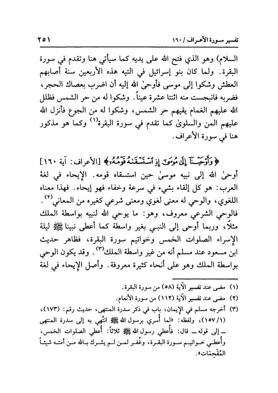 {وَأَوْحَيْنَا إِلَى مُوسَى إِذِ اسْتَسْقَاهُ قَوْمُهُ} [الأعراف: آية ١٦٠] أوحى الله إلى نبيه موسى حين استسقاه قومه. الإيحاء في لغة العرب: هو كل إلقاء بشيء في سرعة وخفاء فهو إيحاء. فهذا معناه اللغوي، والوحي له معنى لغوي ومعنى شرعي كغيره من المعاني (¬٢). فالوحي الشرعي معروف، وهو: ما يوحي الله لنبيه بواسطة الملك مثلاً، وربما أوحى إلى النبي بغير واسطة كما أعطى نبينا صلى الله عليه وسلم ليلة الإسراء الصلوات الخمس وخواتيم سورة البقرة، فظاهر حديث ابن مسعود عند مسلم أنه من غير واسطة الملك (¬٣). وقد يكون الوحي بواسطة الملك وهو على أنحاء كثيرة معروفة. وأصل الإيحاء في لغة