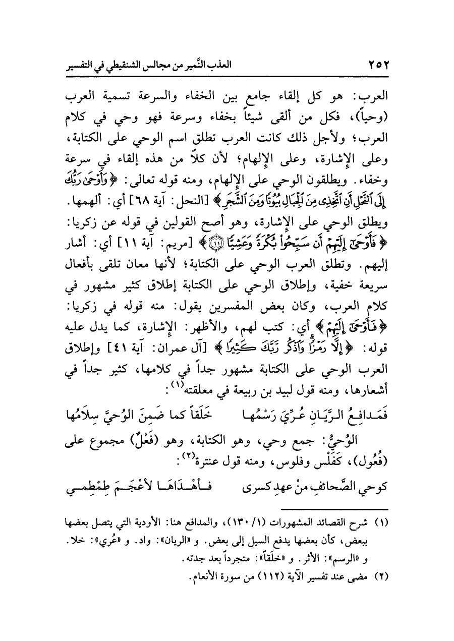 وتطلق العرب الوحي على الكتابة؛ لأنها معان تُلْقَى بِأَفْعَالٍ سَرِيعَةٍ خُفْيَةً، وإطلاق الوحي على الكتابة إطلاق كثير مشهور في كلام العرب، وكان بعض المفسرين يقول: منه قوله في زكريا: {فَأَوْحَى إِلَيْهِمْ} أي: كتب لهم، والأظهر: الإشارة، كما يدل عليه قوله: {إِلَاّ رَمْزًا * وَاذْكُر رَّبَّكَ كَثِيرًا} [آل عمران: آية ٤١] وإطلاق العرب الوحي على الكتابة مشهور جدًّا في كلامها، كثير جدًّا في أشعارها، ومنه قول لبيد بن ربيعة في معلقته (¬١):