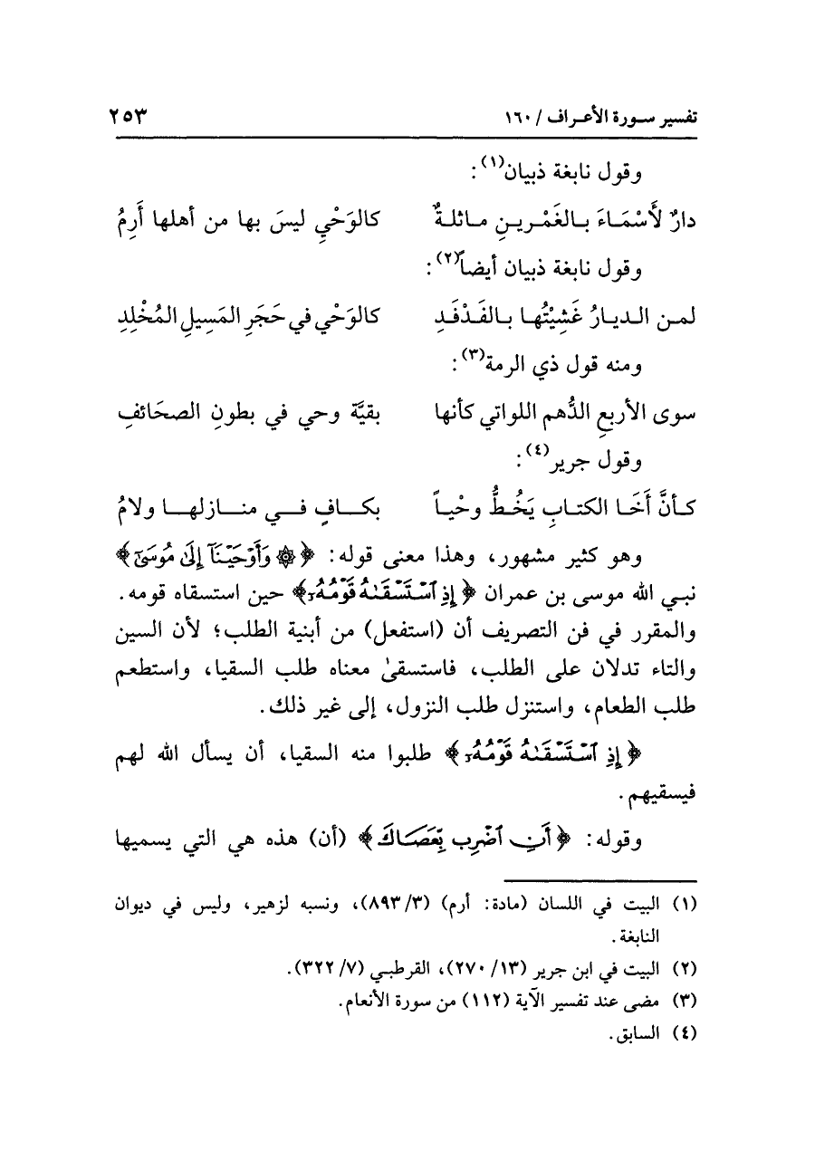 وهو كثير مشهور، وهذا معنى قوله: {وَأَوْحَيْنَا إِلَى مُوسَى} نبي الله موسى بن عمران {إِذِ اسْتَسْقَاهُ قَوْمُهُ} حين استسقاه قومه. والمقرر في فن التصريف أن (استفعل) من أبنية الطلب؛ لأن السين والتاء تدلان على الطلب، فاستسقى معناه طلب السقيا، واستطعم طلب الطعام، واستنزل طلب النزول، إلى غير ذلك.
