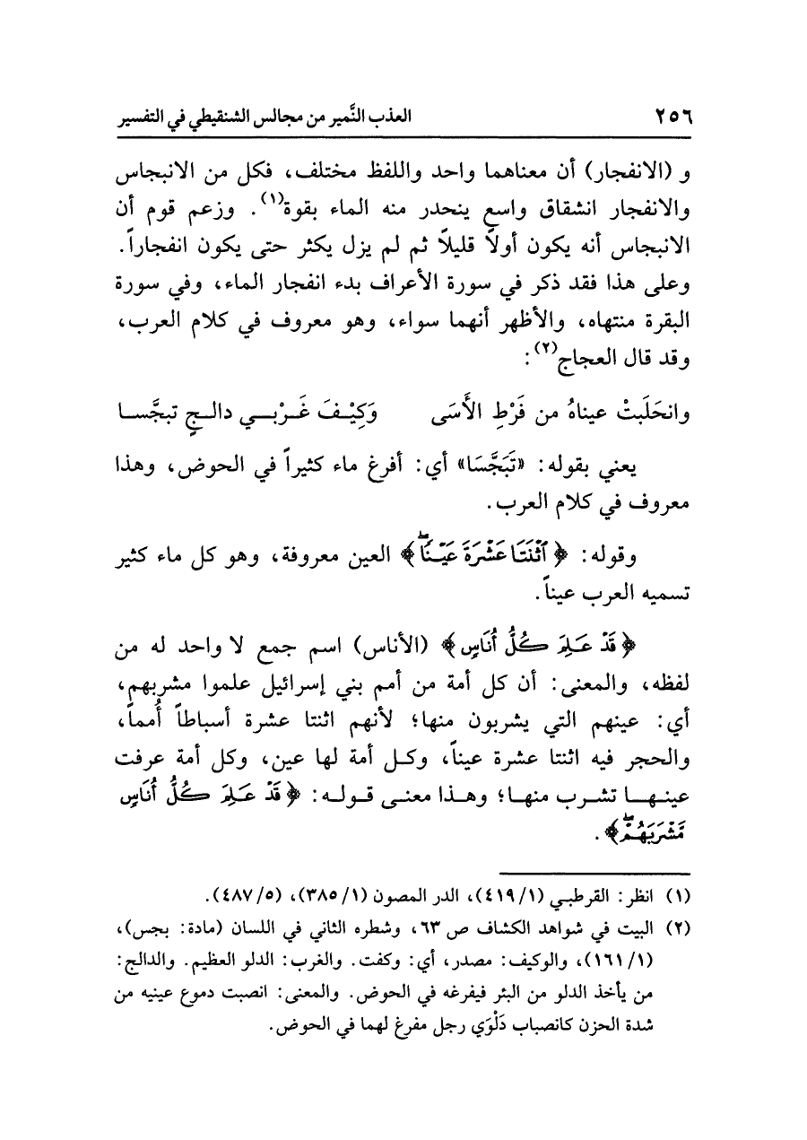 و (الانفجار) أن معناهما واحد واللفظ مختلف، فكل من الانبجاس والانفجار انشقاق واسع ينحدر منه الماء بقوة (¬١). وزعم قوم أن الانبجاس أنه يكون أولاً قليلاً ثم لم يزل يكثر حتى يكون انفجارًا. وعلى هذا فقد ذكر في سورة الأعراف بدء انفجار الماء، وفي سورة البقرة منتهاه، والأظهر أنهما سواء، وهو معروف في كلام العرب، وقد قال العجاج (¬٢):
