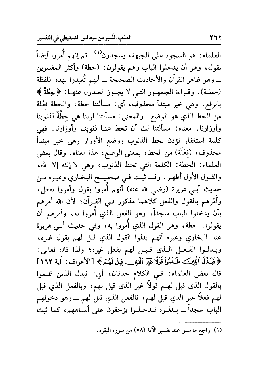 العلماء: هو السجود على الجَبْهَة، يسجدون (¬١). ثم إنهم أُمروا أيضًا بقول، وهو أن يدخلوا الباب وهم يقولون: (حطة) وأكثر المفسرين -وهو ظاهر القرآن والأحاديث الصحيحة- أنهم تُعبدوا بهذه اللفظة (حطة). وقراءة الجمهور التي لا يجوز العدول عنها: {حِطَّةٌ} بالرفع، وهي خبر مبتدأ محذوف، أي: مسألتنا حطة، والحطة فِعْلة من الحط الذي هو الوضع. والمعنى: مسألتنا لربنا هي حِطَّةٌ لذنوبنا وأوزارنا. معناه: مسألتنا لك أن تحط عنا ذنوبنا وأوزارنا، فهي كلمة استغفار تُؤْذِنُ بِحَطِّ الذنوب ووضع الأوزار، وهي خَبَر مبتدأ محذوف، (فِعْلَة) من الحط، بمعنى الوضع، هذا معناه. وقال بعض العلماء: الحطة: الكلمة التي تحط الذنوب، وهي لا إله إلا الله، والقول الأول أظهر.