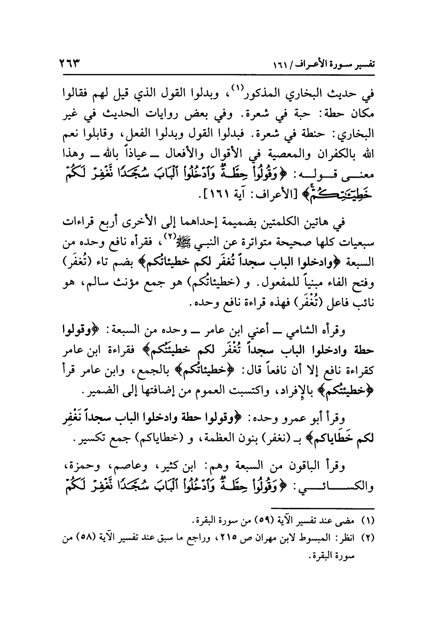 (¬٢) انظر المبسوط لابن مهران ص٢١٥، وراجع ما سبق عند تفسير الآية (٥٨) من سورة البقرة.