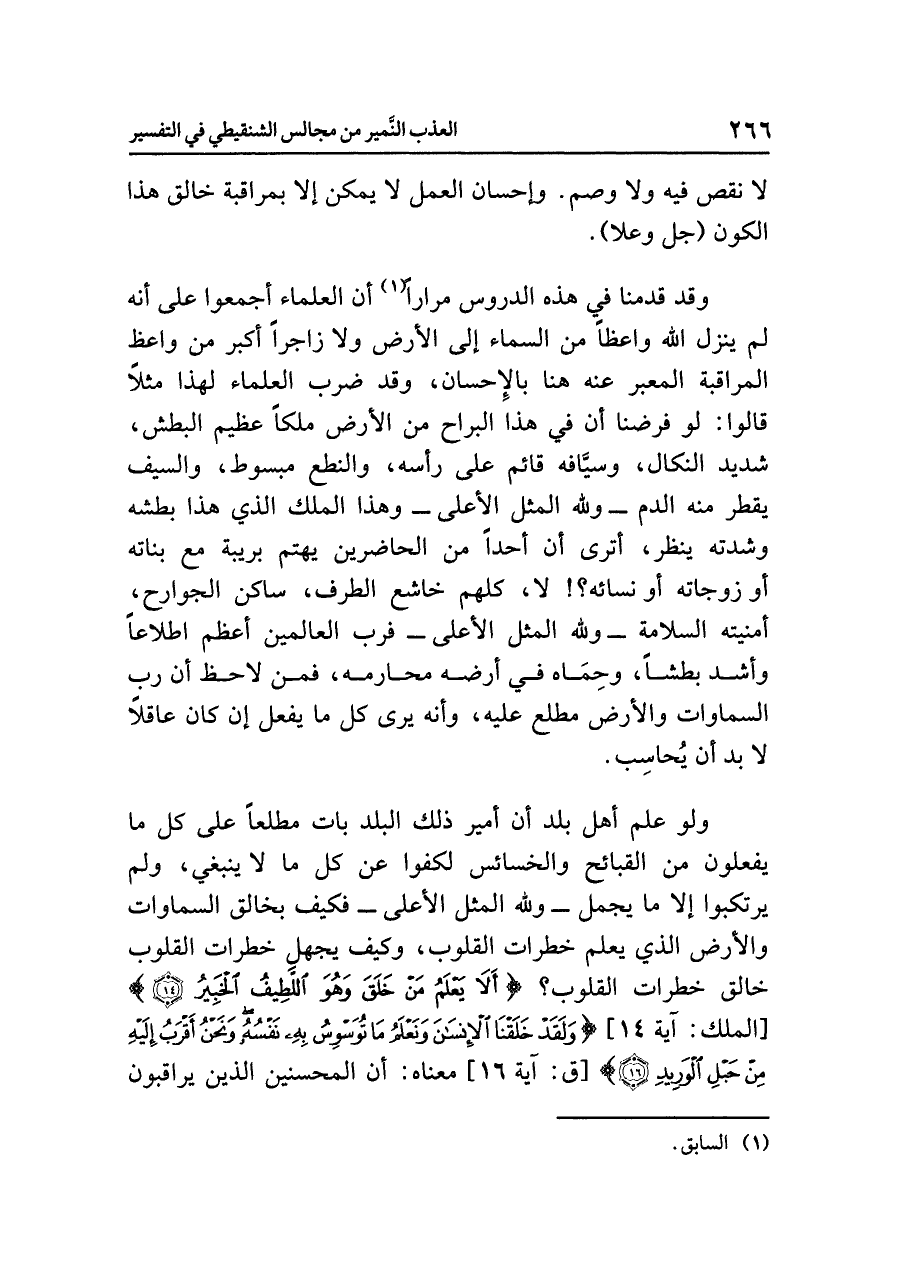 ولو علم أهل بلد أن أمير ذلك البلد بات مطلعًا على كل ما يفعلون من القبائح والخسائس لكفوا عن كل ما لا ينبغي، ولم يرتكبوا إلا ما يجمل -ولله المثل الأعلى- فكيف بخالق السماوات والأرض الذي يعلم خطرات القلوب، وكيف يجهل خطرات القلوب خالق خطرات القلوب؟ {أَلَا يَعْلَمُ مَنْ خَلَقَ وَهُوَ اللَّطِيفُ الْخَبِيرُ (١٤)} [الملك: آية ١٤] {وَلَقَدْ خَلَقْنَا الإِنسَانَ وَنَعْلَمُ مَا تُوَسْوِسُ بِهِ نَفْسُهُ وَنَحْنُ أَقْرَبُ إِلَيْهِ مِنْ حَبْلِ الْوَرِيدِ (١٦)} [ق: آية ١٦] معناه: أن المحسنين الذين يراقبون