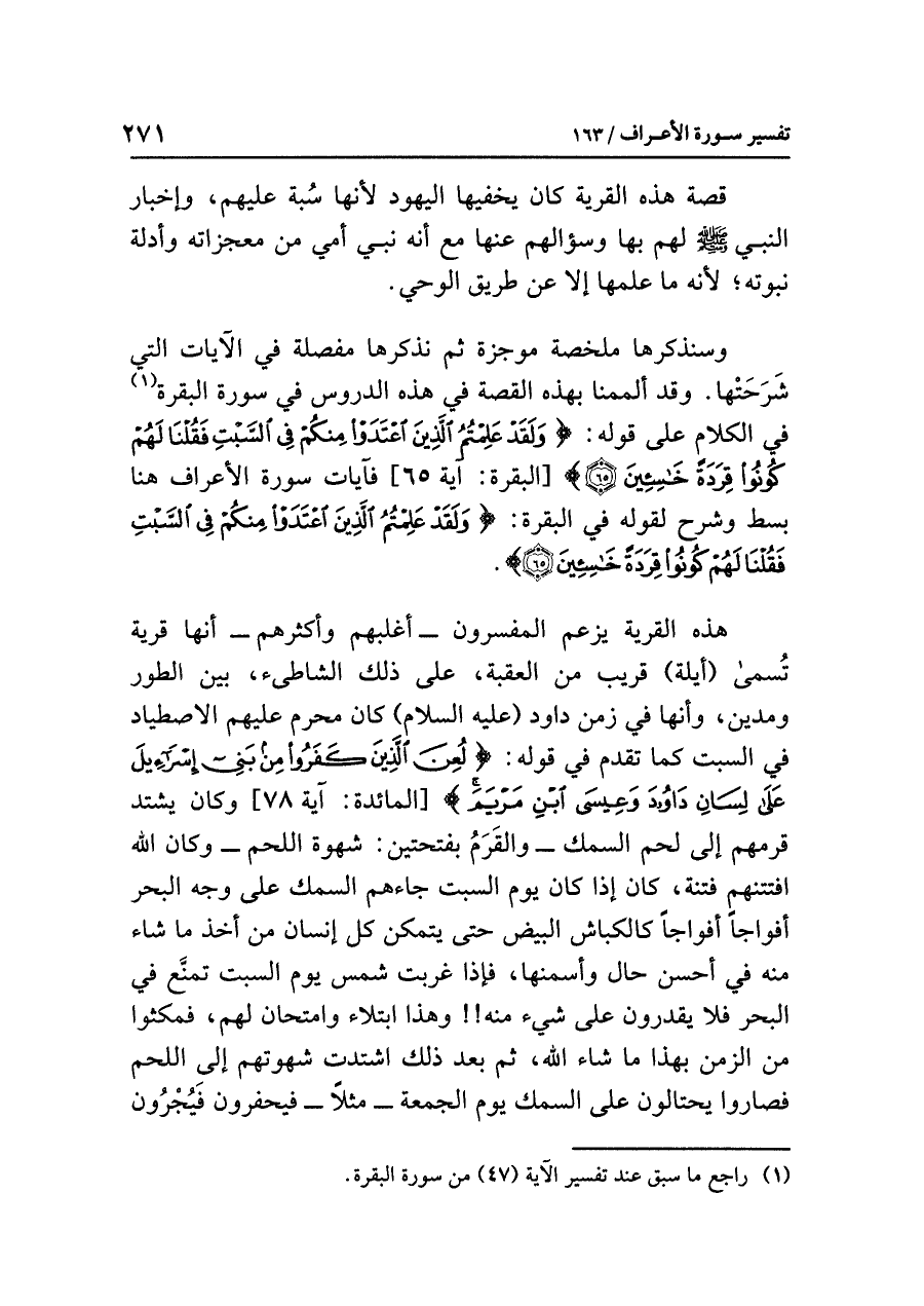 وسنذكرها ملخصة موجزة ثم نذكرها مفصلة في الآيات التي شَرَحَتْها. وقد ألممنا بهذه القصة في هذه الدروس في سورة البقرة (¬١) في الكلام على قوله: {وَلَقَدْ عَلِمْتُمُ الَّذِينَ اعْتَدَواْ مِنكُمْ فِي السَّبْتِ فَقُلْنَا لَهُمْ كُونُواْ قِرَدَةً خَاسِئِينَ (٦٥)} [البقرة: آية ٦٥] فآيات سورة الأعراف هنا بسط وشرح لقوله في البقرة: {وَلَقَدْ عَلِمْتُمُ الَّذِينَ اعْتَدَواْ مِنكُمْ فِي السَّبْتِ فَقُلْنَا لَهُمْ كُونُواْ قِرَدَةً خَاسِئِينَ (٦٥)}.