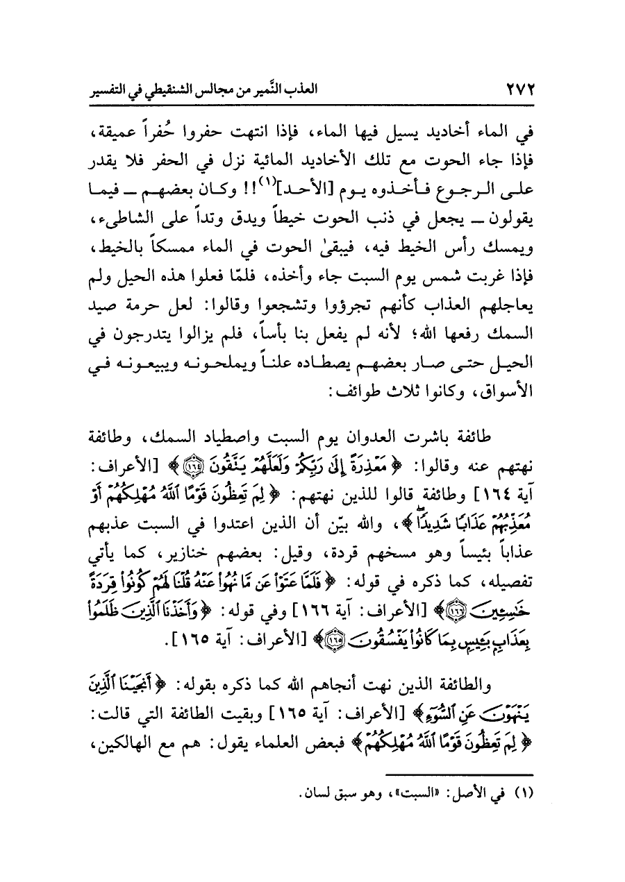 طائفة باشرت العدوان يوم السبت واصطياد السمك، وطائفة نهتهم عنه وقالوا: {مَعْذِرَةً إِلَى رَبِّكُمْ وَلَعَلَّهُمْ يَتَّقُونَ} [الأعراف: آية ١٦٤] وطائفة قالوا للذين نهتهم: {لِمَ تَعِظُونَ قَوْمًا اللَّهُ مُهْلِكُهُمْ أَوْ مُعَذِّبُهُمْ عَذَابًا شَدِيدًا}، والله بيّن أن الذين اعتدوا في السبت عَذَّبَهُمْ عَذَابًا بئيسًا وهو مسخهم قِرَدَة، وقيل: بعضهم خنازير، كما يأتي تفصيله، كما ذكره في قوله: {فَلَمَّا عَتَوْا عَن مَّا نُهُوا عَنْهُ قُلْنَا لَهُمْ كُونُوا قِرَدَةً خَاسِئِينَ (١٦٦)} [الأعراف: آية ١٦٦] وفي قوله: {وَأَخَذْنَا الَّذِينَ ظَلَمُواْ بِعَذَابٍ بَئِيسٍ بِمَا كَانُواْ يَفْسُقُونَ} [الأعراف: آية ١٦٥].