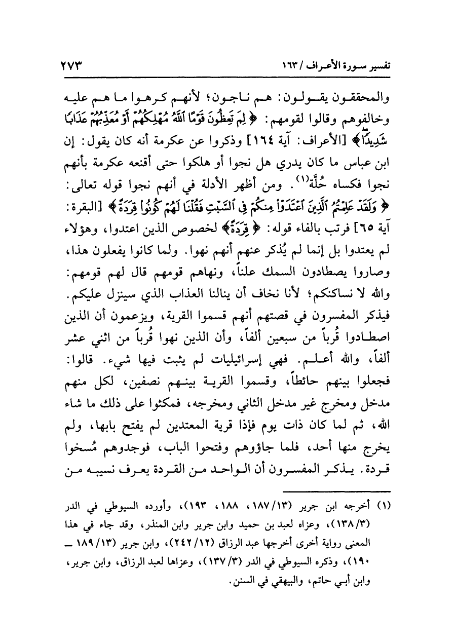 والمحققون يقولون: هم ناجون؛ لأنهم كرهوا ما هم عليه وخالفوهم وقالوا لقومهم: {لِمَ تَعِظُونَ قَوْمًا اللَّهُ مُهْلِكُهُمْ أَوْ مُعَذِّبُهُمْ عَذَابًا شَدِيدًا} [الأعراف: آية ١٦٤] وذكروا عن عكرمة أنه كان يقول: إن ابن عباس ما كان يدري هل نجوا أو هلكوا حتى أقنعه عكرمة بأنهم نجوا فكساه حُلَّة (¬١). ومن أظهر الأدلة في أنهم نجوا قوله تعالى: {وَلَقَدْ عَلِمْتُمُ الَّذِينَ اعْتَدَواْ مِنكُمْ فِي السَّبْتِ فَقُلْنَا لَهُمْ كُونُواْ قِرَدَةً} [البقرة: آية ٦٥] فرتب بالفاء قوله: {قِرَدَةً} لخصوص الذين اعتدوا، وهؤلاء لم يعتدوا بل إنما لم يُذكر عنهم أنهم نهوا. ولما كانوا يفعلون هذا، وصاروا يصطادون السمك علنًا، ونهاهم قومهم قال لهم قومهم: والله لا نساكنكم؛ لأنا نخاف أن ينالنا العذاب الذي سينزل عليكم. فيذكر المفسرون في قصتهم أنهم قسموا القرية، ويزعمون أن الذين اصطادوا قُربًا من سبعين ألفًا، وأن الذين نهوا قُربًا من اثني عشر ألفًا، والله أعلم. فهي إسرائيليات لم يثبت فيها شيء. قالوا: فجعلوا بينهم حائطًا، وقسموا القرية بينهم نصفين، لكل منهم مدخل ومخرج غير مدخل الثاني ومخرجه، فمكثوا على ذلك ما شاء الله، ثم لما كان ذات يوم فإذا قرية المعتدين لم يفتح بابها، ولم يخرج منها أحد، فتسوروا عليهم الحائط فوجدوهم -والعياذ بالله- مُسخوا قردة.