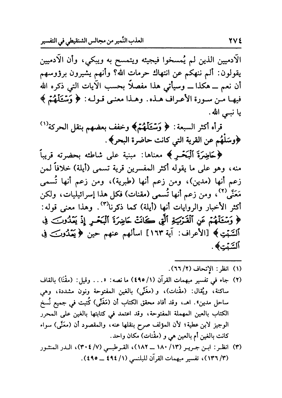 الآدميين الذين لم يُمسخوا فيجيئه ويتمسح به ويبكي، وأن الآدميين يقولون: ألم ننهكم عن انتهاك حرمات الله؟ وأنهم يشيرون برؤوسهم أن نعم -هكذا- وسيأتي هذا مفصلاً بحسب الآيات التي ذكره الله فيها من سورة الأعراف هذه. وهذا معنى قوله: {واسْأَلْهُمْ} يا نبي الله.