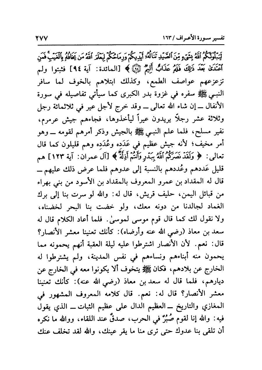 لَيَبْلوَنَّكُمُ اللَّهُ بِشيء مِّنَ الصَّيْدِ تَنَالُهُ أَيْدِيكُمْ وَرِمَاحُكُمْ لِيَعْلَمَ اللَّهُ مَن يَخَافُهُ بِالْغَيْبِ فَمَنِ اعْتَدَى بَعْدَ ذَلِكَ فَلَهُ عَذَابٌ أَلِيمٌ (٩٤)} [المائدة: آية ٩٤] فثبتوا ولم تزعزعهم عواصف الطمع، وكذلك ابتلاهم بالخوف لما سافر النبي صلى الله عليه وسلم سفره في غزوة بدر الكبرى كما سيأتي تفاصيله في سورة الأنفال -إن شاء الله تعالى- وقد خرج لأجل عير في ثلاثمائة رجل وثلاثة عشر رجلاً يريدون عيرًا ليأخذوها، فجاءهم جيش عرمرم، نفير مسلح، فلما علم النبي صلى الله عليه وسلم بالجيش وذكر أمرهم لقومه -وهو أمر مخيف؛ لأنه جيش عظيم في عَدَدِه وعُدَدِه وهم قليلون كما قال تعالى: {وَلَقَدْ نَصَرَكُمُ اللَّهُ بِبَدْرٍ وَأَنتُمْ أَذِلَّةٌ} [آل عمران: آية ١٢٣] هم قليل عَددهم وعُددهم بالنسبة إلى عدوهم فلما عرض ذلك عليهم- قال له المقداد بن عمرو المعروف بالمقداد بن الأسود من بني بهراء من قبائل اليمن، حليف قريش، قال له: والله لو سرت بنا إلى برك الغماد لجالدنا من دُونَهُ معك، ولو خضت بنا البحر لخضناه، ولا نقول لك كما قال قوم موسى لموسى فلما أعاد الكلام قال له سعد بن معاذ (رضي الله عنه وأرضاه): كأنك تعنينا معشر الأنصار؟ قال: نعم. لأن الأنصار اشترطوا عليه ليلة العقبة أنهم يحمونه مما يحمون منه أبناءهم ونساءهم في نفس المدينة، ولم يشترطوا له الخارج عن بلادهم، فكان صلى الله عليه وسلم يتخوف ألا يكونوا معه في الخارج عن ديارهم، فلما قال له سعد بن معاذ (رضي الله عنه): كأنك تعنينا معشر الأنصار؟ قال له: نعم. قال كلامه المعروف المشهور في المغازي والتاريخ -العظيم الدال على عظيم الثبات- الذي يقول فيه: والله إنا لقوم صُبُرٌ في الحرب، صُدَّقٌ عند اللقاء، ووالله ما نكره أن تلقى بنا عدوك حتى ترى منا ما يقر عينك، والله لقد تخلف عنك
