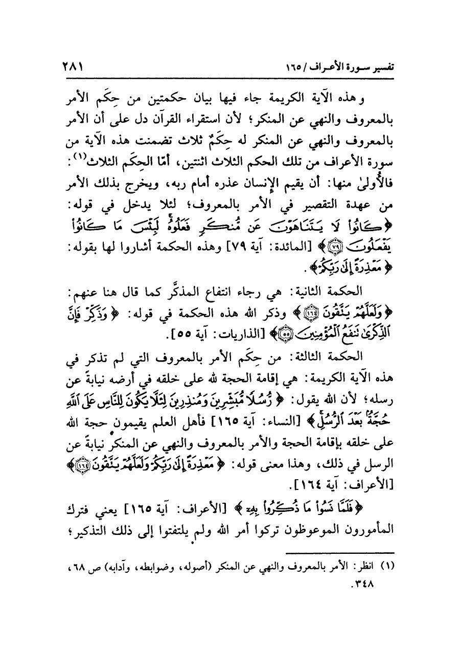 وهذه الآية الكريمة جاء فيها بيان حكمتين من حِكَم الأمر بالمعروف والنهي عن المنكر؛ لأن استقراء القرآن دل على أن الأمر بالمعروف والنهي عن المنكر له حِكَمٌ ثلاث تضمنت هذه الآية من سورة الأعراف من تلك الحكم الثلاث اثنتين، أمّا الحِكَم الثلاث (¬١):