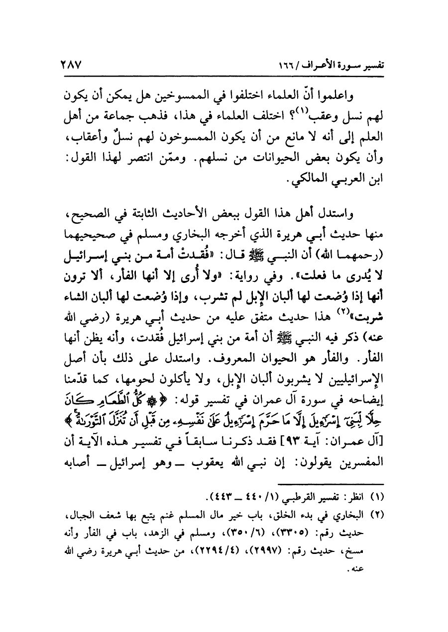 واستدل أهل هذا القول ببعض الأحاديث الثابتة في الصحيح، منها حديث أبي هريرة الذي أخرجه البخاري ومسلم في صحيحيهما (رحمهما الله) أن النبي صلى الله عليه وسلم قال: «فُقِدَتْ أُمَّةٌ مِنْ بَنِي إِسْرَائِيلَ لَا يُدْرَى مَا فَعَلَتْ». وفي رواية: «ولَا أُرَى إِلَاّ أنَّهَا الفَأْرُ، أَلَا تَرَوْنَ أَنَّهَا إِذَا وُضِعَتْ لهَا أَلْبَانُ الإِبِلِ لَمْ تَشْرَبْ، وَإِذَا وُضِعَتْ لَهَا أَلْبَانُ الشَّاءِ شَرِبَتْ» (¬٢) هذا حديث متفق عليه من حديث أبي هريرة (رضي الله عنه) ذكر فيه النبي صلى الله عليه وسلم أن أمة من بني إسرائيل فُقدت، وأنه يظن أنَّهَا الفأر. والفأر هو الحيوان المعروف. واستدل على ذلك بأن أصل الإسرائيليين لا يشربون ألبان الإبل، ولا يأكلون لحومها، كما قدّمنا إيضاحه في سورة آل عمران في تفسير قوله: {كُلُّ الطَّعَامِ كَانَ حِلاً لِّبَنِي إِسْرَائِيلَ إِلَاّ مَا حَرَّمَ إِسْرَائِيلُ عَلَى نَفْسِهِ مِن قَبْلِ أَن تُنَزَّلَ التَّوْرَاةُ} [آل عمران: آية ٩٣] فقد ذكرنا سابقًا في تفسير هذه الآية أن المفسرين يقولون: إن نبي الله يعقوب -وهو إسرائيل- أصابه