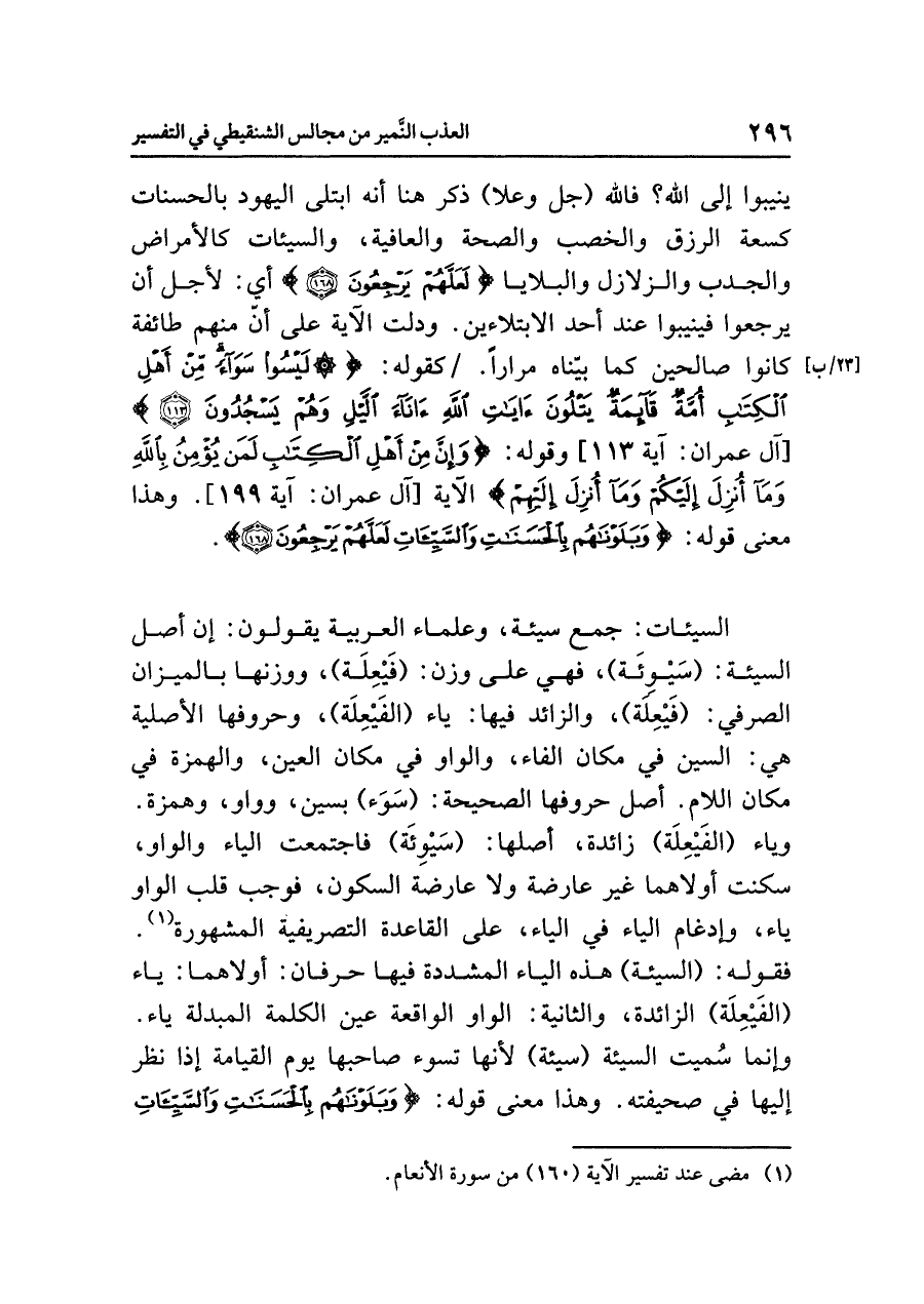 السيئات: جمع سيئة، وعلماء العربية يقولون: إن أصل السيئة: (سَيْوِئَة)، فهي على وزن: (فَيْعِلَة)، ووزنها بالميزان الصرفي: (فَيْعِلَة)، والزائد فيها: ياء (الفَيْعِلَة)، وحروفها الأصلية هي: السين في مكان الفاء، والواو في مكان العين، والهمزة في مكان اللام. أصل حروفها الصحيحة: (سَوَء) بسين، وواو، وهمزة. وياء (الفَيْعِلَة) زائدة، أصلها: (سَيْوِئَة) فاجتمعت الياء والواو، وسكنت أولاهما غير عارضة ولا عارضة السكون، فوجب قلب الواو ياء، وإدغام الياء في الياء، على القاعدة التصريفية المشهورة (¬١). فقوله: (السيئة) هذه الياء المشددة فيها حرفان: أولاهما: ياء (الفَيْعِلَة) الزائدة، والثانية: الواو الواقعة عين الكلمة المبدلة ياء. وإنما سُميت السيئة (سيئة) لأنها تسوء صاحبها يوم القيامة إذا نظر إليها في صحيفته. وهذا معنى قوله: {وَبَلَوْنَاهُمْ بِالْحَسَنَاتِ وَالسَّيِّئَاتِ