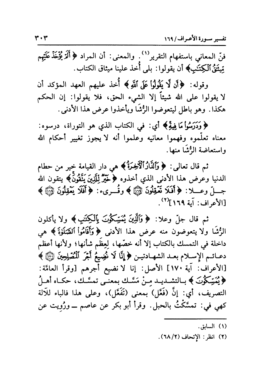 ثم قال جلّ وعلا: {وَالَّذِينَ يُمَسِّكُونَ بِالْكِتَابِ} ولا يأكلون الرُّشَا ولا يَتَعَوَّضُون منه عرض هذا الأدنى {وَأَقَامُواْ الصَّلَاةَ} هي داخلة في التمسك بالكتاب إلا أنه خصّها، لِعِظَم شأنها؛ ولأنها أعظم دعائم الإسلام بعد الشهادتين {إِنَّا لَا نُضِيعُ أَجْرَ الْمُصْلِحِينَ} [الأعراف: آية ١٧٠] الأصل: إنا لا نضيع أجرهم [وقرأ العامّة: {يُمسِّكُونَ} بالتشديد مِنْ مَسَّك بمعنى تمسَّك، حكاه أهلُ التصريف، أي: إنَّ (فَعَّل) بمعنى (تَفَعَّل)، وعلى هذا فالباء للآلة كهي في: تمسَّكْتُ بالحبل. وقرأ أبو بكر عن عاصم -ورُوِيت عن