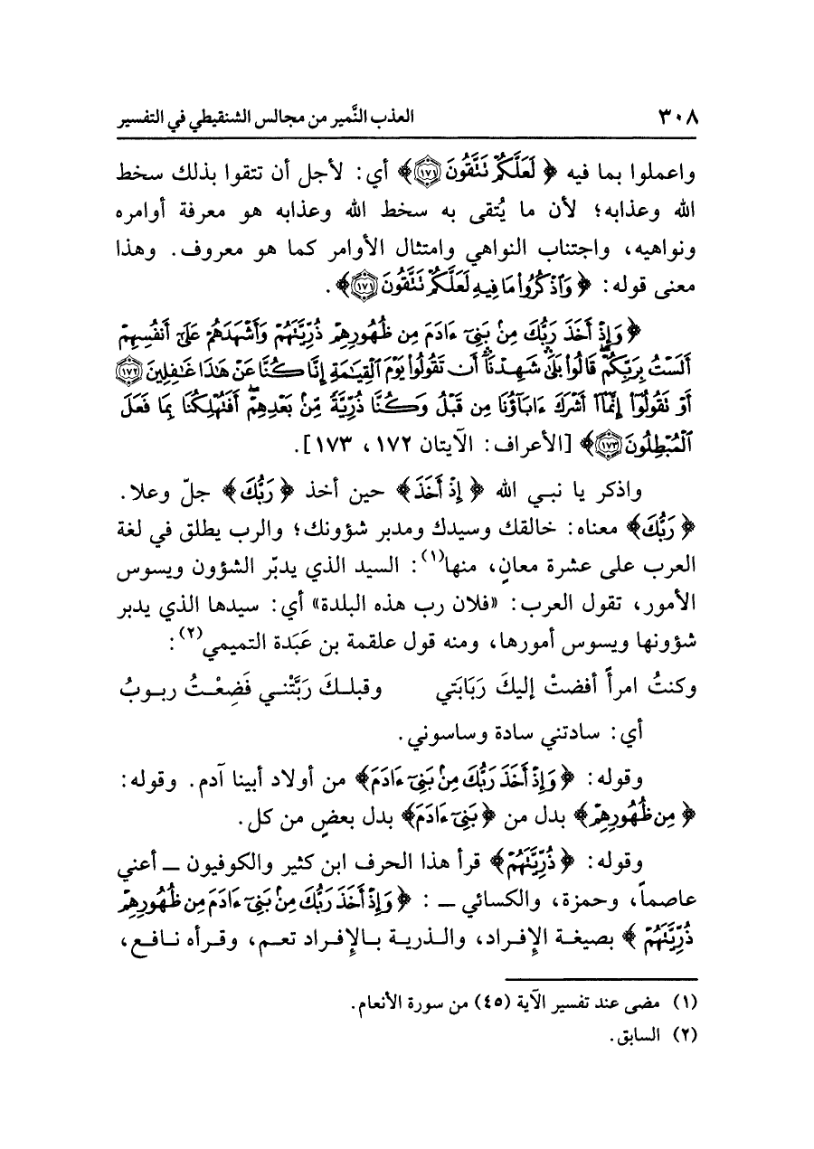 {وَإِذْ أَخَذَ رَبُّكَ مِن بَنِي آدَمَ مِن ظُهُورِهِمْ ذُرِّيَّتَهُمْ وَأَشْهَدَهُمْ عَلَى أَنفُسِهِمْ أَلَسْتُ بِرَبِّكُمْ قَالُواْ بَلَى شَهِدْنَا أَن تَقُولُواْ يَوْمَ الْقِيَامَةِ إِنَّا كُنَّا عَنْ هَذَا غَافِلِينَ (١٧٢) أَوْ تَقُولُواْ إِنَّمَا أَشْرَكَ آبَاؤُنَا مِن قَبْلُ وَكُنَّا ذُرِّيَّةً مِّن بَعْدِهِمْ أَفَتُهْلِكُنَا بِمَا فَعَلَ الْمُبْطِلُونَ (١٧٣)} [الأعراف: الآيتان ١٧٢، ١٧٣].