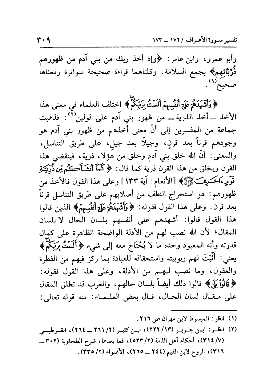 {وَأَشْهَدَهُمْ عَلَى أَنفُسِهِمْ أَلَسْتُ بِرَبِّكُمْ} اختلف العلماء في معنى هذا الأخذ -أخذ الذرية- من ظهور بني آدم على قولين (¬٢): فذهبت جماعة من المفسِّرِين إلى أنّ مَعْنَى أخْذِهِم من ظهور بني آدم هو وجودهم قَرْنًا بعد قَرْنٍ، وجيلاً بعد جِيل، على طريق التناسل، والمعنى: أنّ اللهَ خلق بني آدم وخلق من هؤلاء ذرية، فينقضي هذا القرن ويخلق من هذا القرن ذرية كما قال: {كَمَا أَنشَأَكُم مِّن ذُرِّيَّةِ قَوْمٍ آخَرِينَ} [الأنعام: آية ١٣٣] وعلى هذا القول فالأخذ من ظهورهم: هو استخراج النُّطَف من أصلابهم على طريق التناسل قرنًا بعد قرن. وعلى هذا القول فقوله: {وَأَشْهَدَهُمْ عَلَى أَنفُسِهِمْ} الذين قالوا هذا القول قالوا: أشهدهم على أنفسهم بلسان الحال لا بلسان المقال؛ لأن الله نصب لهم من الأدلة الواضحة الظاهرة على كمال قدرته وأنه المعبود وحْدَه ما لا يُحْتَاج معه إلى شيء {أَلَسْتُ بِرَبِّكُمْ} يعني: أَثْبَتَ لهم ربوبيته واستحقاقه للعبادة بما ركز فيهم من الفِطْرَة والعقول، وما نصب لهم من الأدِلَّة، وعلى هذا القول فقوله: {قَالُواْ بَلَى} قالوا ذلك أيضًا بلسان حالهم، والعرب قد تطلق المقال على مقال لسان الحال، قال بعض العلماء: منه قوله تعالى: