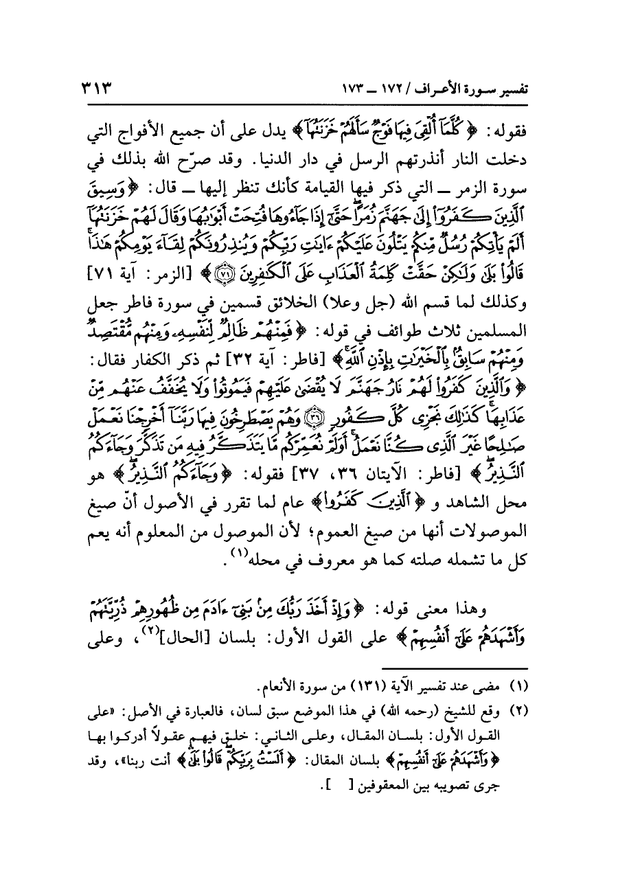 وقد صرّح الله بذلك في سورة الزمر - التي ذكر فيها القيامة كأنك تنظر إليها- قال: {وَسِيقَ الَّذِينَ كَفَرُوا إِلَى جَهَنَّمَ زُمَرًا حَتَّى إِذَا جَاءُوهَا فُتِحَتْ أَبْوَابُهَا وَقَالَ لَهُمْ خَزَنَتُهَا أَلَمْ يَأْتِكُمْ رُسُلٌ مِّنكُمْ يَتْلُونَ عَلَيْكُمْ آيَاتِ رَبِّكُمْ وَيُنذِرُونَكُمْ لِقَاء يَوْمِكُمْ هَذَا قَالُوا بَلَى وَلَكِنْ حَقَّتْ كَلِمَةُ الْعَذَابِ عَلَى الْكَافِرِينَ (٧١)} [الزمر: آية ٧١] وكذلك لما قسم الله (جل وعلا) الخلائق قسمين في سورة فاطر جعل المسلمين ثلاث طوائف في قوله: {فَمِنْهُمْ ظَالِمٌ لِّنَفْسِهِ وَمِنْهُم مُّقْتَصِدٌ وَمِنْهُمْ سَابِقٌ بِالْخَيْرَاتِ بِإِذْنِ اللَّهِ} [فاطر: آية ٣٢] ثم ذكر الكفار فقال: {وَالَّذِينَ كَفَرُوا لَهُمْ نَارُ جَهَنَّمَ لَا يُقْضَى عَلَيْهِمْ فَيَمُوتُوا وَلَا يُخَفَّفُ عَنْهُم مِّنْ عَذَابِهَا كَذَلِكَ نَجْزِي كُلَّ كَفُورٍ (٣٦) وَهُمْ يَصْطَرِخُونَ فِيهَا رَبَّنَا أَخْرِجْنَا نَعْمَلْ صَالِحًا غَيْرَ الَّذِي كُنَّا نَعْمَلُ أَوَلَمْ نُعَمِّرْكُم مَّا يَتَذَكَّرُ فِيهِ مَن تَذَكَّرَ وَجَاءكُمُ النَّذِيرُ} [فاطر: الآيتان ٣٦، ٣٧] فقوله: {وَجَاءكُمُ النَّذِيرُ} هو محل الشاهد و {وَالَّذِينَ كَفَرُوا} عام لما تَقَرَّر في الأصول أنّ صيغ الموصولات أنها من صيغ العموم؛ لأن الموصول من المعلوم أنه يعم كل ما تشمله صلته كما هو معروف في محله (¬١).