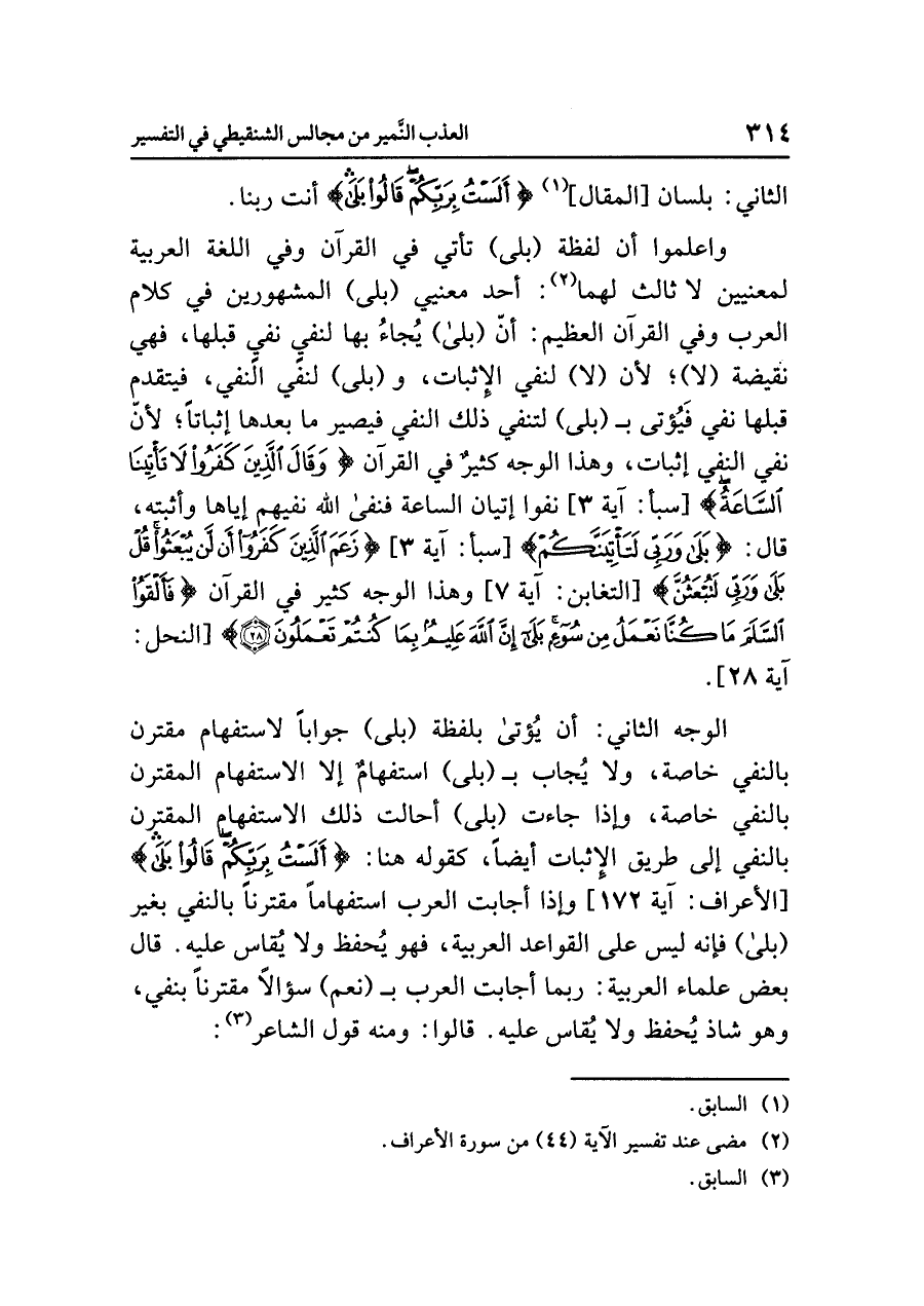 الوجه الثاني: أن يُؤْتَى بلفظة (بلى) جوابًا لاستفهام مُقْتَرِنٍ بالنَّفْيِ خاصَّةً، ولا يُجاب بـ (بلى) استفهامٌ إلا الاستفهام المقترن بالنفي خاصة، وإذا جاءت (بلى) أحالت ذلك الاستفهام المقترن بالنَّفْيِ إِلَى طريق الإثبات أيضًا، كقوله هنا: {أَلَسْتُ بِرَبِّكُمْ قَالُواْ بَلَى} [الأعراف: آية ١٧٢] وإذا أجَابَتِ الْعَرَبُ اسْتِفْهَامًا مقترنًا بالنفي بغير (بلى) فإنه ليس على القواعد العربية، فهو يُحفظ ولا يُقاس عليه. قال بعض علماء العربية: ربما أجابت العرب بـ (نعم) سؤالاً مقترنًا بنفي، وهو شاذ يُحفظ ولا يُقاس عليه. قالوا: ومنه قول الشاعر (¬٣):