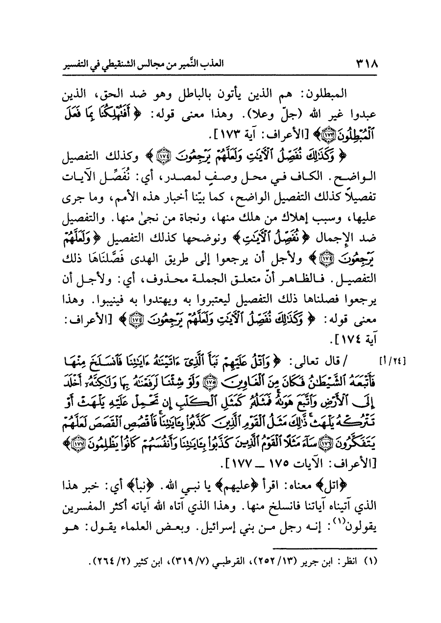 {وَكَذَلِكَ نُفَصِّلُ الآيَاتِ وَلَعَلَّهُمْ يَرْجِعُونَ (١٧٤)} وكذلك التفصيل الواضح. الكاف في محل وصفٍ لمصدر، أي: نُفَصِّل الآيات تفصيلاً كذلك التفصيل الواضح، كما بَيَّنَّا أخبار هذه الأمم، وما جَرَى عليها، وسبب إهلاك مَنْ هَلَكَ منها، ونجاة مَنْ نَجا منها. والتفصيل ضِدّ الإجْمَالِ {نُفَصِّلُ الآيَاتِ} ونُوَضِّحُهَا كذلك التفصيل {وَلَعَلَّهُمْ يَرْجِعُونَ} ولأجل أن يرجعوا إلى طريق الهدى فَصَّلنَاهَا ذلك التفصيل. فالظاهر أنّ متعلق الجملة محذوف، أي: ولأجل أن يرجعوا فَصَّلْنَاها ذلك التفصيل ليعتبروا به ويهتدوا به فينيبوا. وهذا معنى قوله: {وَكَذَلِكَ نُفَصِّلُ الآيَاتِ وَلَعَلَّهُمْ يَرْجِعُونَ (١٧٤)} [الأعراف: آية ١٧٤].